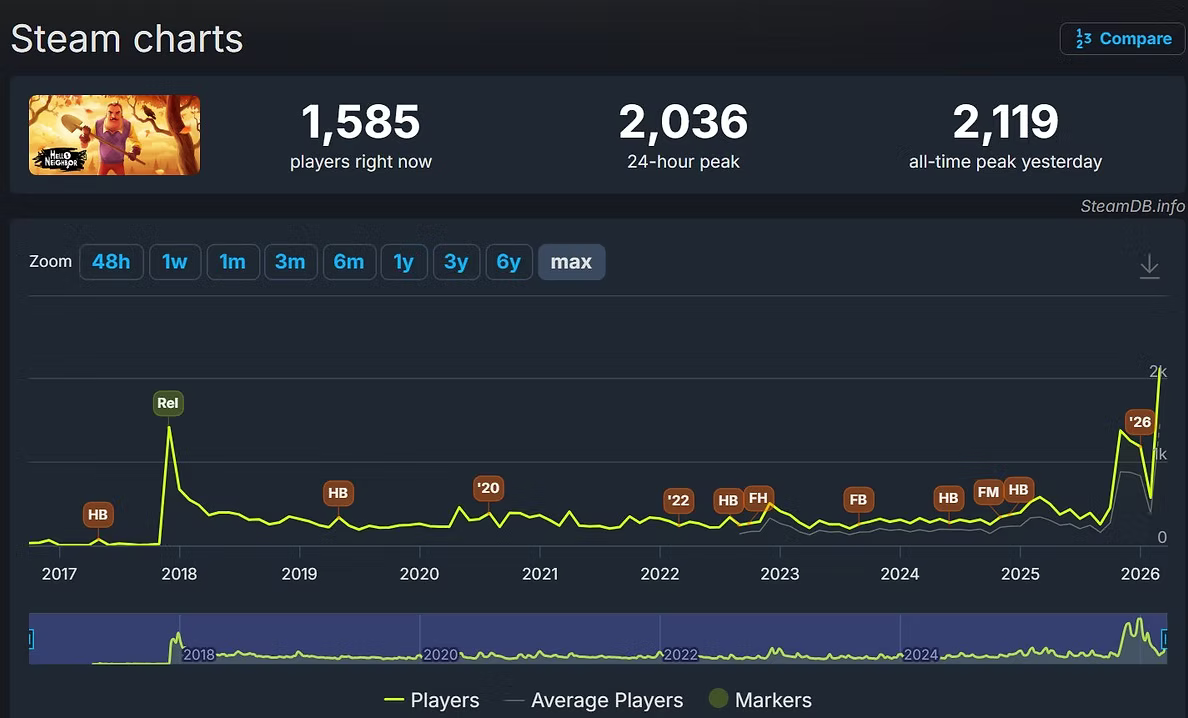 Глава издательства tinyBuild Алекс Ничипорчик поделился успехами оригинальной игры Hello Neighbor, которая вышла 8 лет назад. Проект неожиданно обновил рекорд пикового онлайна в Steam и разошелся тиражом в 100000 копий всего за 1 неделю во время весенней распродажи. По словам руководителя, прошлый декабрь стал лучшим для игры с момента релиза, принеся более 60000 проданных копий. Такой всплеск интереса разработчики объясняют совпадением ряда факторов. В 4 квартале 2025 года в мастерской Steam произошел взрывной рост активности создателей модов. Сейчас там доступно более 2200 модификаций, некоторые из которых стали вирусными на YouTube. Дополнительно аудиторию подогрел анонс нового дизайна главного героя для игры Hello Neighbor 3 и ожидание 3 сезона анимационного сериала. Разработчики также отмечают изменение поведения игроков, так как выросшие пользователи мобильных устройств и консолей постепенно переходят на ПК. Алекс Ничипорчик подчеркнул, что традиционная модель независимого издате