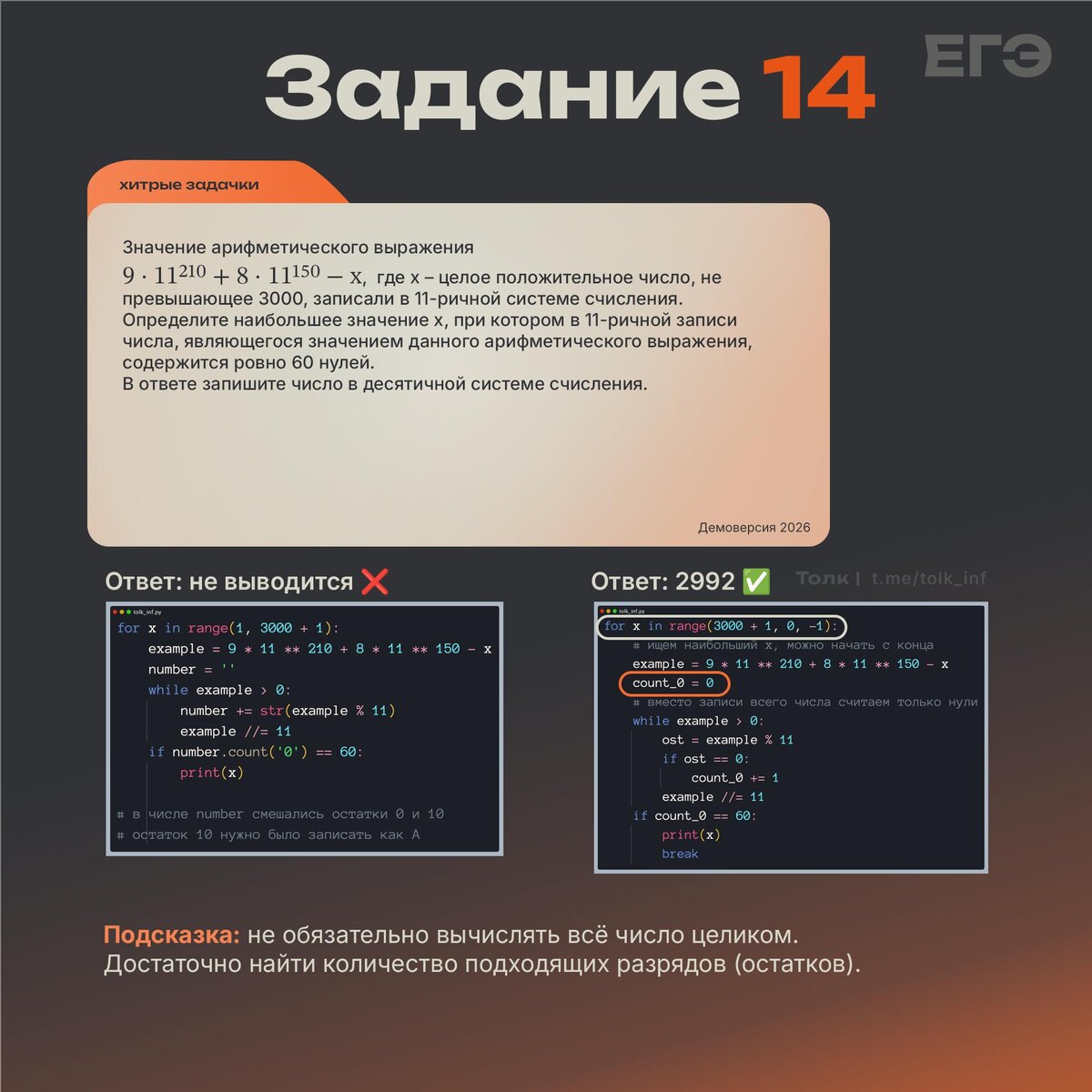 В системах счисления с основанием > 10 появляются «двузначные» цифры: остаток 10 записывается как A, 11 — как B и так далее. Если об этом забыть, в переведённом числе будет невозможно отличить, где был остаток 10, а где 1 и 0. Что с этим делать? 🟡 Список вместо строки Сохранять остатки в list. Надёжно, но при очень больших степенях список может получиться слишком «тяжёлым». 🟡 Функция с буквами Писать полноценный перевод с заменой 10 → 'A', 11 → 'B'. Для подобных задач это долго и избыточно. 🟢 Прямой подсчёт (оптимально) Не сохранять число целиком, а считать подходящие остатки. Этот способ самый быстрый и универсальный, работает для любой системы счисления. #задачки #егэ #егэ_14 —————— Читайте там, где вам удобнее: VK • TikTok • Max • Дзен • Telegram