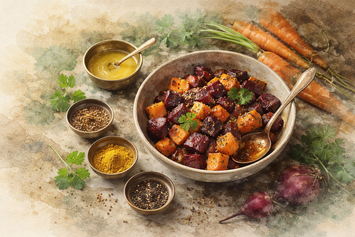 Я аюрведист. Веду школу. Рассказываю людям, что и как есть. И восемь лет сам не ел свёклу. Просто не любил. Скользкая, земляная, оставляет пятна. Находил причины обходить её в магазине. А потом разобрался, что именно она делает изнутри — и стал есть три раза в неделю. За месяц вернулась лёгкость, которой я уже почти не помнил. Вот что я упускал. В Бхагавад-гите есть строки о еде, которую предпочитают люди в гуне благости: она увеличивает жизненную силу, питает ткани, приносит устойчивость. «Сочная, маслянистая, здоровая, приятная сердцу» — это дословно. Корнеплоды в аюрведе — именно такая еда. Сладкий вкус, тяжёлое качество, земляное начало. Они питают глубокие ткани, выводят аму — накопленные шлаки — и при этом дают сытость без тяжести. Это не противоречие: тяжёлое само по себе, но тёплое приготовление делает их лёгкими для усвоения. Три корнеплода, которые я включаю в рацион сам и даю своим ученикам — свёкла, морковь, батат. Каждый работает по-своему. Свёкла в аюрведе — саттвичная ед