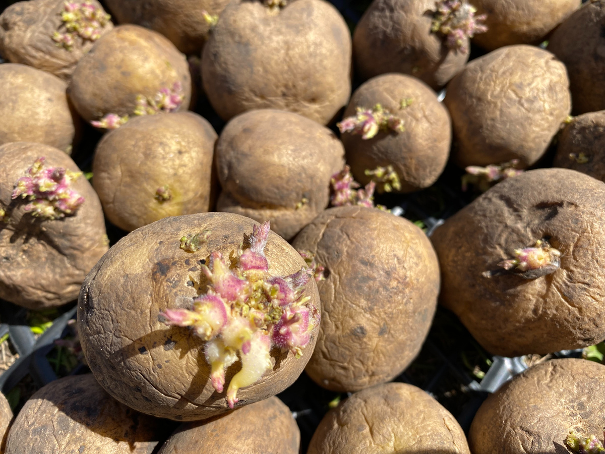 В идеале это нужно делать за 3–4 недели до посадки, чтобы на срезах образовался защитный слой. После этого клубни проращивают при температуре 16–18° днём и 8–10° ночью. Первую неделю их держат срезами вверх, а потом переворачивают.