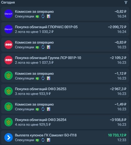 ! 💸 Сегодня в портфеле есть хоть какая-то движуха — пришли купоны по Самолёту БО-П18 на 10 733,12 ₽. ❤️ И ещё отдельно хочу сказать спасибо за реакции под утренним постом. Честно говоря, я так и не понял, что именно значит реакция ✍️ рука с ручкой, но мне в любом случае очень приятно. Спасибо вам огромное за активность и поддержку. 📌 Итак, что мы имеем за сегодня: 🟢ОФЗ 26254 — 4 шт 🟢 ОФЗ 26253 — 3 шт 🟢ЛСР 001Р-10 — 2 шт 🟢 ГЛОРАКС 001Р-05 — 2 шт 🧩 Логика тут всё та же: часть денег отправил в ОФЗ как в более спокойную базу портфеля, а ЛСР и ГЛОРАКС добрал, чтобы потихоньку усиливать общую доходность. 🤝 В общем, купоны пришли — деньги сразу снова в работу. Без суеты, но шаг за шагом продолжаем собирать портфель. 💬 Спасибо, что читаете, ставите реакции и вообще остаетесь здесь. Для меня это правда ценно. 📱Облигации просто 📨Обратная связь ✴️ДЗЕН 💳 Пульс 💸На развитие канала