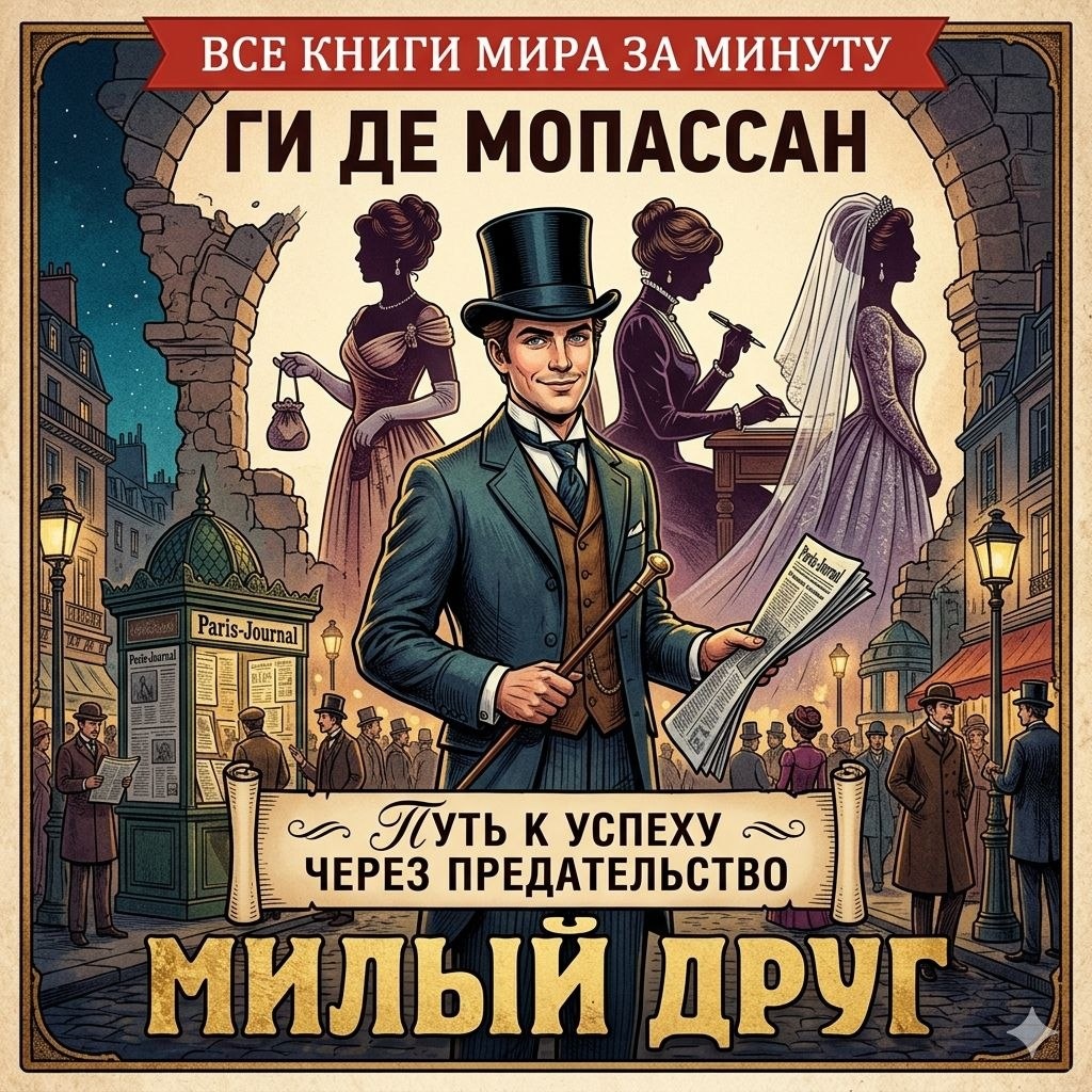ВСЕ КНИГИ МИРА ЗА МИНУТУ Ги де Мопассан — «Милый друг» Суть в одной фразе: История восхождения беспринципного соблазнителя из нищеты к вершинам власти и богатства, построенная исключительно на манипуляциях женщинами. Мир и герои: Париж конца XIX века. Жорж Дюруа — бывший военный, у которого в кармане нет и нескольких франков, но есть эффектная внешность и полное отсутствие совести. Он попадает в мир журналистики и политики, где искренность считается слабостью, а связи — единственной валютой. Сюжетный драйв: Первый шаг: Случайная встреча со старым армейским товарищем Форестье открывает Дюруа двери в редакцию газеты. Понимая, что сам он писать не умеет, Жорж использует жену товарища, Мадлен, которая пишет статьи за него. Женщины как ступени: Дюруа заводит череду романов: от госпожи де Марель, дающей ему деньги и страсть, до госпожи Вальтер, жены своего патрона. Каждая новая любовница — это либо новый социальный статус, либо важная информация, либо капитал. Цинизм как кредо: Жорж