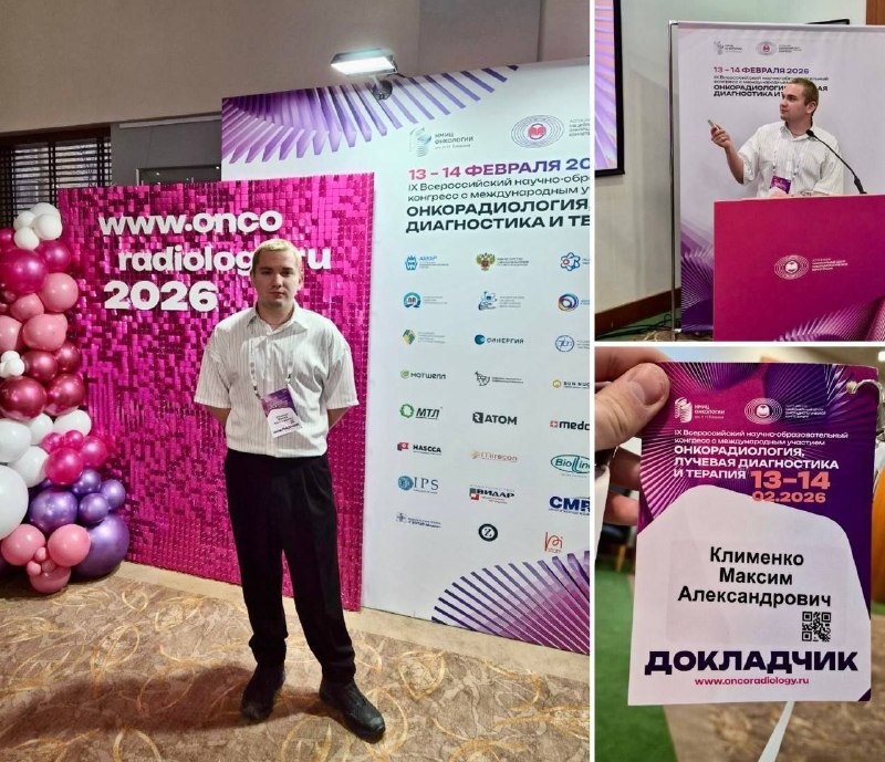 13-14 февраля 2026 года в Москве прошел IX Всероссийский конгресс с международным участием «Онкорадиология, лучевая диагностика и терапия» (сайт, программа и сборник тезисов) На конгрессе с устным докладом “Исследование кинетики высвобождения 1,2-дикарболида кобальта из полимерных частиц” по теме своего диссертационного исследования выступил аспирант 2-го года ИБХФ РАН, м.н.с. лаборатории количественной онкологии - Клименко Максим Александрович Клименко М.А. о конгрессе: «Принимаю участие в этом конгрессе уже не первый раз и каждый год вижу, как он становится всё масштабнее и интереснее. Всё больше участников, новых направлений и действительно полезных обсуждений. Особенно мне нравится традиционная секция для молодых учёных - она не просто про доклады, а про общение и обмен опытом. Здесь можно услышать комментарии от специалистов, понять, как улучшить презентацию или на что стоит сделать больший акцент в работе. Атмосфера всегда тёплая и поддерживающая, и именно это делает участие по‑н