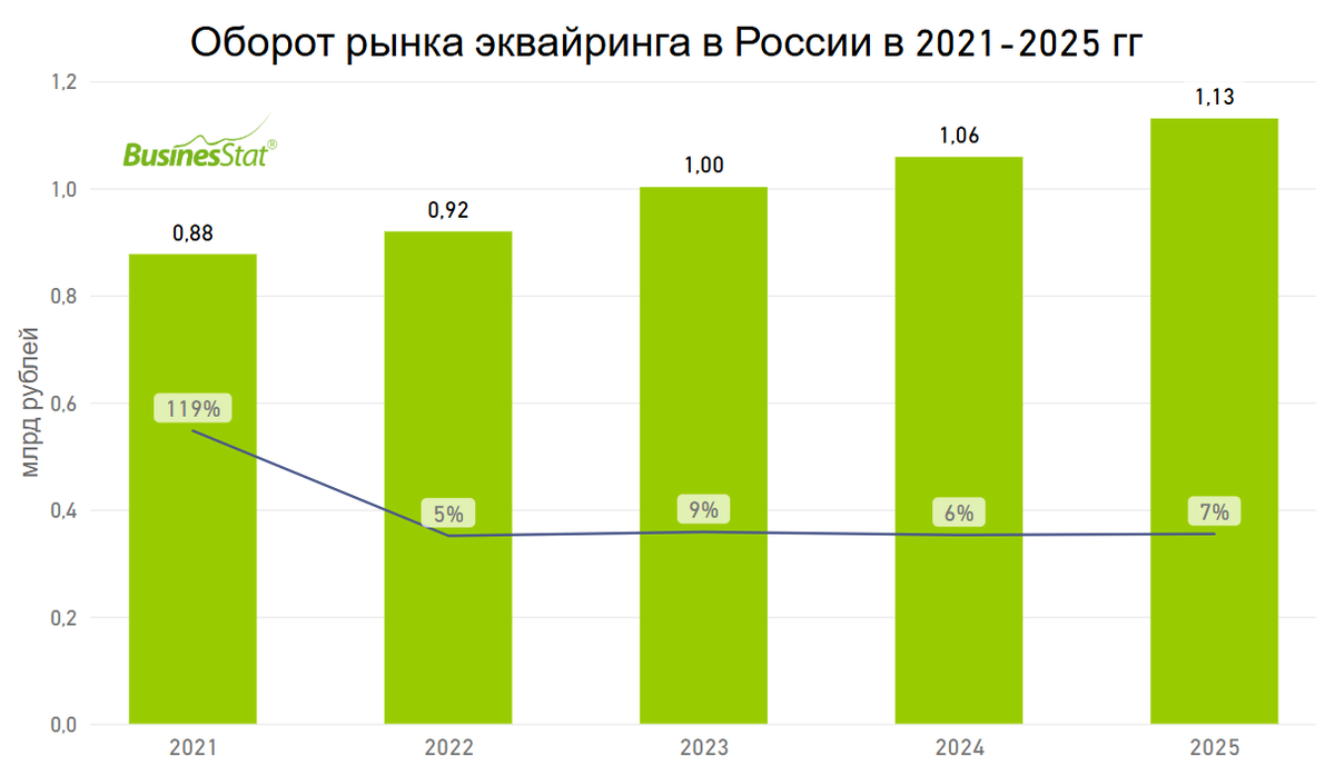 За 2021-2025 гг оборот рынка эквайринга в России вырос на 29% с 0,88 до 1,13 трлн рублей.