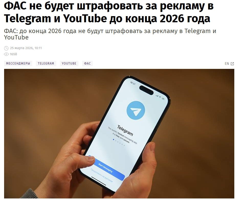 ФАС установила переходный период до конца 2026 года для адаптации рекламодателей к новым правилам. В это время штрафы за рекламу в Telegram и YouTube применяться не будут. Разберем, что это значит и как использовать этот период с максимальной пользой. Что произошло Федеральная антимонопольная служба (ФАС) объявила о переходном периоде, который продлится до конца 2026 года. В течение этого времени меры ответственности за распространение рекламы в Telegram и на YouTube применяться не будут. Это решение дает рекламодателям время на подготовку к возможным изменениям в регулировании. Источники указывают на высокую уверенность в этих фактах, но конкретные новые правила пока не раскрыты. Почему это важно Telegram и YouTube являются популярными каналами для продвижения товаров. Отсрочка штрафов до 2026 года позволяет продолжать использовать эти платформы без немедленных рисков. Однако неопределенность относительно будущих правил требует proactive подхода. Рекомендуется использовать этот период