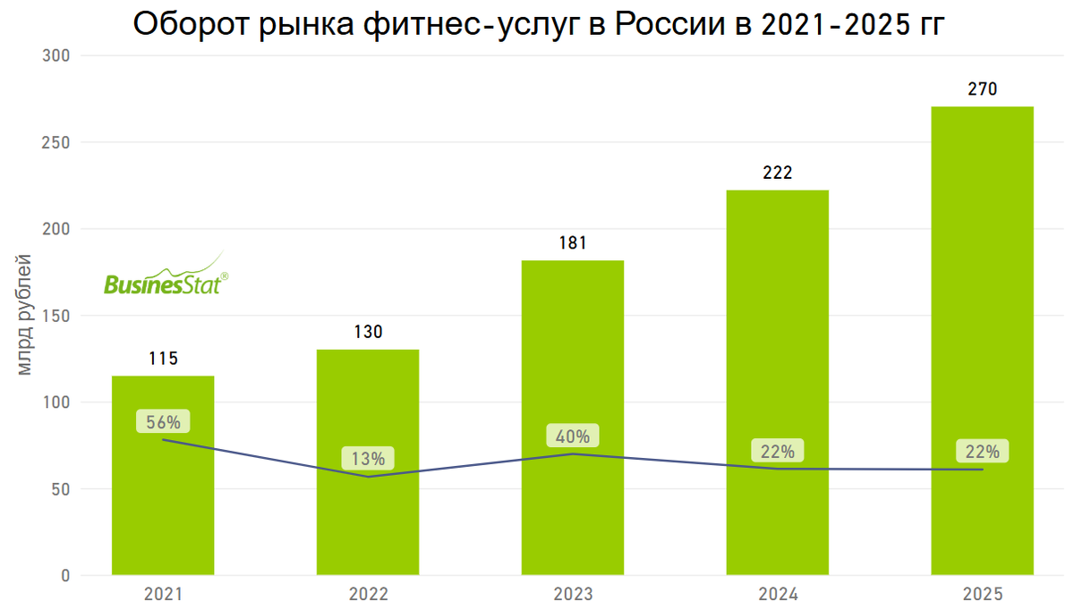 В 2021-2025 гг оборот рынка фитнес-услуг в России вырос в 2,4 раза: со 115 до 270 млрд рублей.