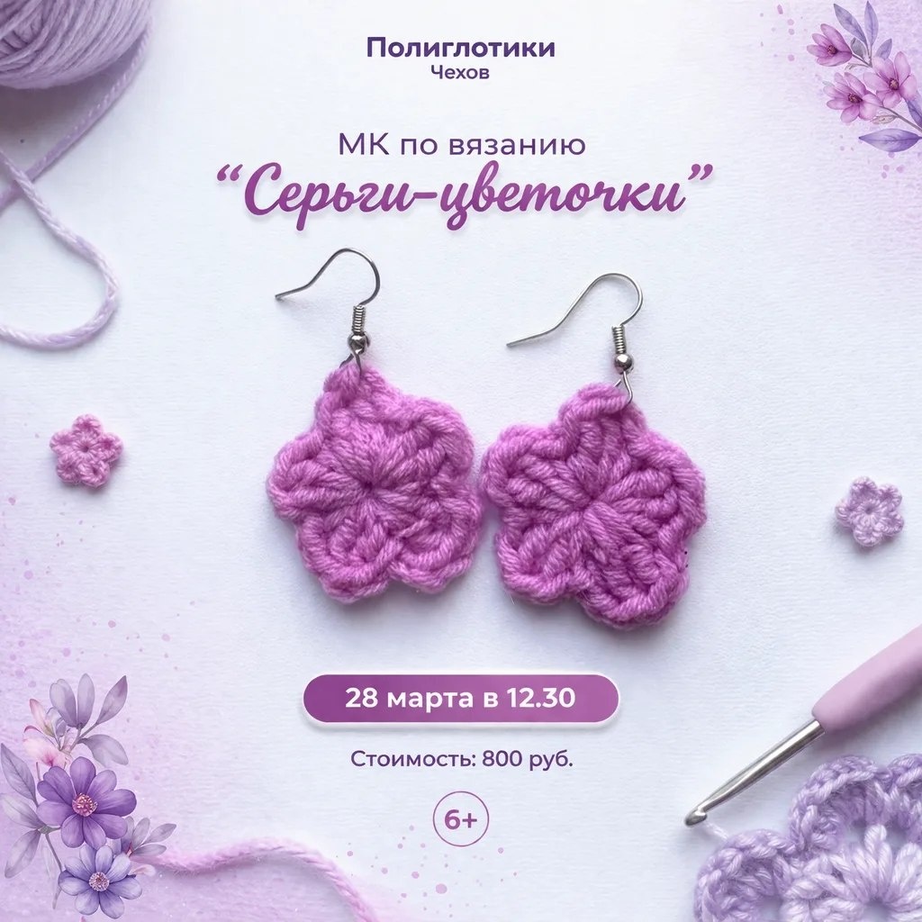 ✨ МК по вязанию крючком 🌸 Приглашаем на творческий мастер-класс! Хотите создать стильное украшение своими руками? Ждём вас на уютном МК по вязанию «Серьги-цветочки»💖 Вы научитесь вязать нежные цветочные элементы и создадите свои собственные уникальные серьги — отличный аксессуар или подарок! 📍 Подходит для детей от 6 лет 🗓 28 марта в 12:30 💰 Стоимость: 800 руб. Количество мест ограничено — записывайтесь заранее! Творите с удовольствием вместе с «Полиглотиками» ✨ 🚫 Возраст: 6+ 📆 28.03.2026 🕛 12:30 🏢 Языковой образовательный центр "ПОЛИГЛОТИКИ" 📍 г. Чехов, ул. Уездная, д. 2 🔗 Записаться: https://t.me/PoliglotikiChekhov 🌟Соц.сети: 🔥https://vk.com/poliglotikichekhov 🔥https://dzen.ru/id/65d5ffd4021a5d4953ccf615 🫶 Получить консультацию и записаться: 🫶 Поддержите нас голосами