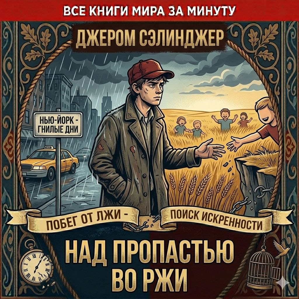ВСЕ КНИГИ МИРА ЗА МИНУТУ Джером Сэлинджер — «Над пропастью во ржи» Суть в одной фразе: Искренняя и пронзительная исповедь подростка, который отчаянно бунтует против взрослого мира лжи, фальши и «липы». Мир и герои: Нью-Йорк, середина XX века. Холден Колфилд — семнадцатилетний юноша, которого в очередной раз исключили из престижной частной школы. Он умён, чувствителен, но задыхается от цинизма и конформизма окружающих его взрослых и сверстников. Единственное существо, которое он любит и понимает — его младшая сестра Фиби. Сюжетный драйв: Побег: Не дожидаясь официального исключения, Холден уходит из школы и отправляется в Нью-Йорк, чтобы «погулять» несколько дней, пока родители не узнают правду. Он бродит по городу, встречается с людьми, пытается завязать отношения, но везде натыкается на непонимание и фальшь. Взрослый мир: Нью-Йорк кажется Холдену огромной свалкой «липы». Он видит в барах, гостиницах и на улицах лишь эгоизм, глупость и душевную пустоту. Встреча с любимым учителем