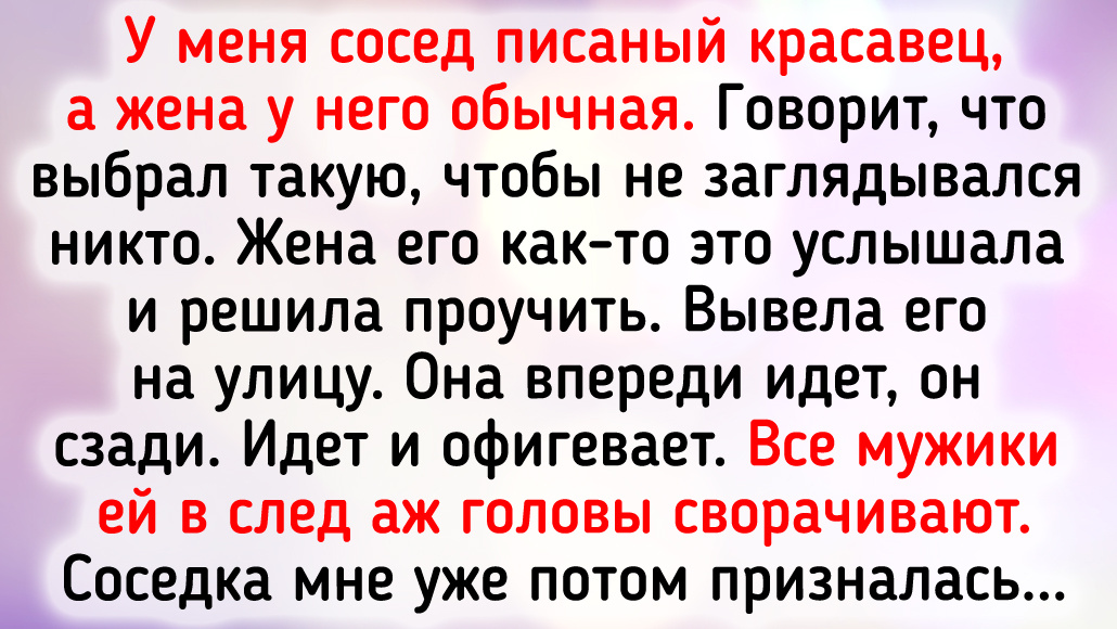 Порой люди с готовностью осуждают парочки, которые на них взгляд не подходят друг другу. То возраст, якобы, не подходящий, то статус, то другие причины. Вот несколько историй любви, в которых люди сошлись, руководствуясь только чувствами, а не чьими-то ожиданиями. У некоторых все получилось, а у других... Вышло так, как вышло. У меня сосед писаный красавец, а жена у него обычная. Говорит, что выбрал такую, чтобы не заглядывался никто. Жена его как-то это услышала и решила проучить. Вывела на улицу. Она впереди идет, он сзади. Идет и офигевает. Все мужики ей в след аж головы сворачивают. Соседка мне потом призналась: «Шла я по тротуару и каждому встречному рожи корчила. Вот они и поворачивались». Кстати, жили она душа в душу, тут главное женская смекалка. © Лукреция Борджиа Брат много лет назад привел домой будущую жену, я все застолье в себя прийти не могла. Мне показалось, что она какая-то не такая. Решила, что она ему не пара, ведь он такой красавчик, еще и домашний, с юмором. А она