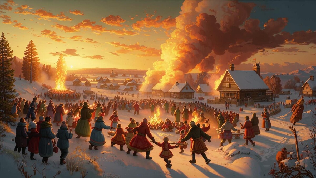 Представь себе конец февраля или начало марта. Снег ещё лежит, но солнце уже припекает по-весеннему. На улице шумно, людно. С горы летят сани, в воздухе пахнет блинами и дымом костров. В центре деревни возвышается чучело — огромная соломенная баба в лохмотьях. Её будут сжигать вечером, и в этом огне сгорит всё старое, ненужное, отжившее. А завтра наступит Великий пост — время тишины и покаяния. Но сегодня — последний день, когда можно есть скоромное, шуметь, веселиться и объедаться блинами. Сегодня — Масленица. Праздник, который не укладывается в рамки ни церковного, ни государственного календаря. Он старше и того, и другого.