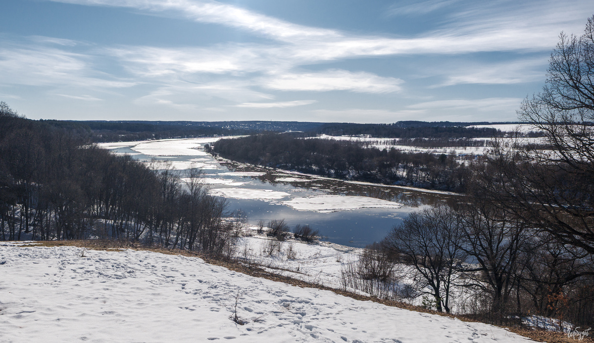 Лёд на большой реке никогда не уходит тихо. Он не тает — он ломается, трещит, сдвигается и уходит, двигаясь вниз по течению, будто река за одну ночь вспоминает, что она живая. В это воскресенье я как раз попал на такой момент — не на начало ледохода, не на его конец, а на самую «работу» реки по освобождению из ледяного плена. С высокого берега Ока ещё кажется спокойной. Белые поля льда, прорезанные тёмной водой, медленно ползут вдоль изгибов русла. Где-то уже открылись проталины, где-то лёд ещё держится, но видно — не надолго. Пейзаж обманчиво тихий, но это только издалека. Стоит спуститься ближе — и всё меняется. У берега лёд уже не цельный, а разбитый на тяжёлые пластины. Они наползают друг на друга, скрипят, крошатся, переворачиваются. Толстые, слоистые, с кромками, покрытыми инеем — каждая такая льдина, будто отдельный объект – со своей формой и фактурой. В какой-то момент начинаешь ловить себя на том, что смотришь не на реку, а на движение. На поток, который перетаскивает всё вокр