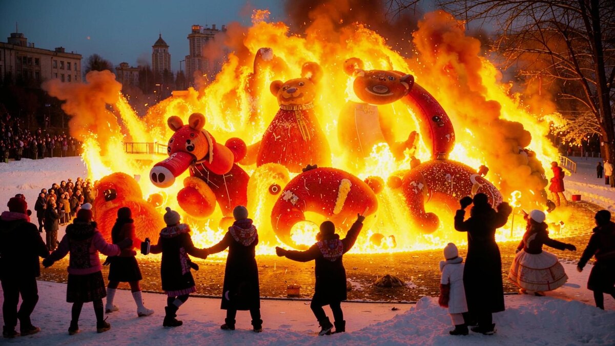 Представь себе закат воскресного дня. На окраине деревни собралась вся округа. В центре площади возвышается огромное соломенное чучело — нарядное, в лентах и бусах, с блином в руке. Последние лучи солнца золотят его, придавая почти живой облик. Кто-то подносит факел. Огонь медленно охватывает солому, чучело начинает крениться, трещать, и вот уже высоко в небо взлетают искры. В этот момент все замолкают, а потом разом начинают кричать, петь, смеяться. В костёр летят блины, старые вещи, прошлогоднее сено. Всё, что отжило, должно сгореть. А завтра — тишина, пепелище и начало Великого поста. Но сегодня — последний огонь зимы, последний круглый блин, последний глоток вина перед долгим воздержанием.