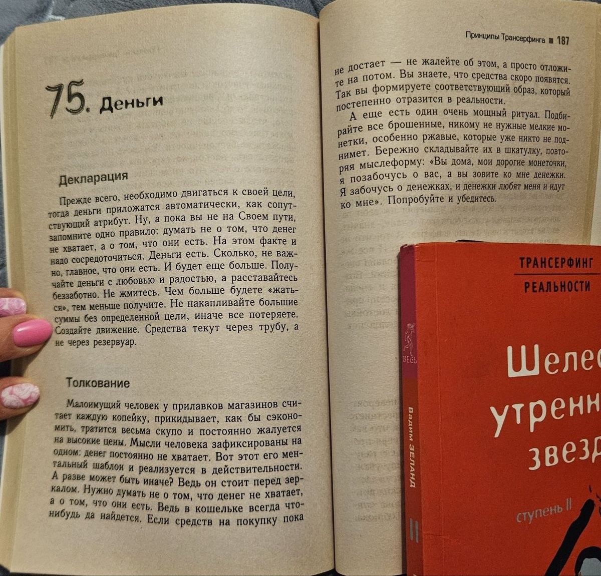 75/78 Практикум управления реальностью - Трансерфинг Деньги "Прежде всего необходимо двигаться к своей цели, тогда деньги приложатся автоматически, как сопутствующий атрибут. Ну, а пока вы не на своем пути, запомните одно правило: думать не о том, что денег не хватает, а о том, что они есть. На этом факте надо и сосредоточиться. Деньги есть. Сколько, не важно, главное, что они есть. И будет еще больше. Получайте деньги с любовью и радостью, а расставайтесь беззаботно. Не жмитесь. Чем больше будете "жаться", тем меньше получите. Не накапливайте большие суммы без определенной цели, иначе все потеряете. Создайте движение. Средства текут через трубу, а не через резервуар." "Малоимущий человек у прилавков магазинов считает каждую копейку, прикидывает, как бы сэкономить, тратится весьма скупо и постоянно жалуется на высокие цены. Мысли человека зафиксированы на одном: денег постоянно не хватает. Вот этот его ментальный шаблон и реализуется в действительности. А разве может быть иначе? Ве