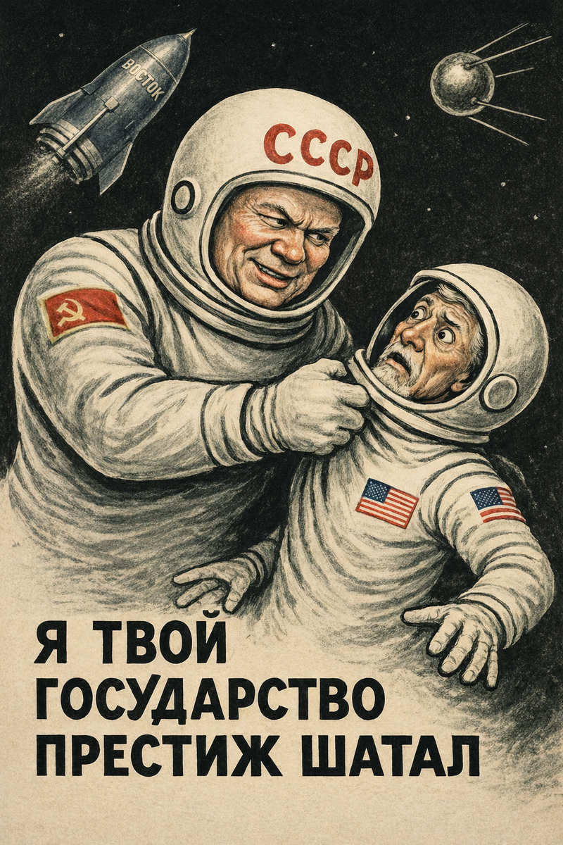 В процессе обсуждения получилась вот такая карикатура поясняющая мотивацию США к дорогим и опасным полётам на Луну в 1960-е.