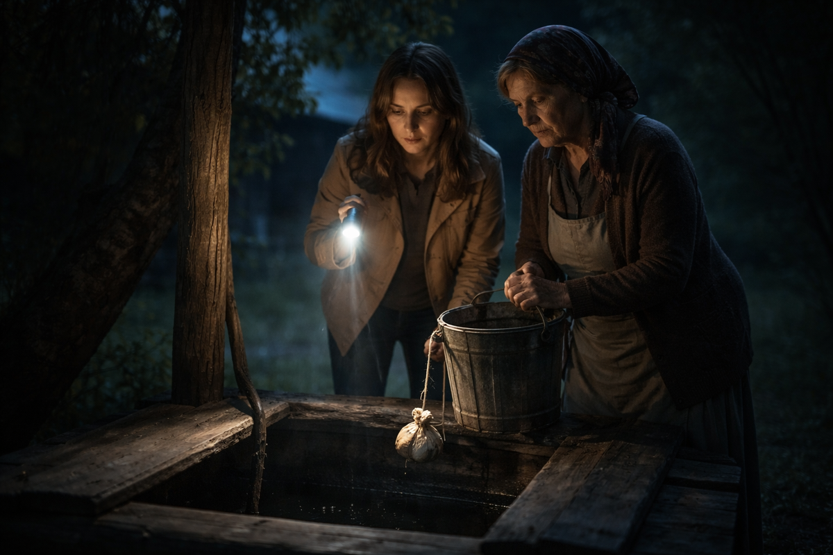 Она не вскрикнула. Просто фонарь в её руке дрогнул, луч метнулся по доскам, по верёвке, по тёмной воде внизу. Никого. Ни тени, ни шороха у забора, ни шага на дорожке. Только капли с крыши колодца одна за другой падали на влажную землю.