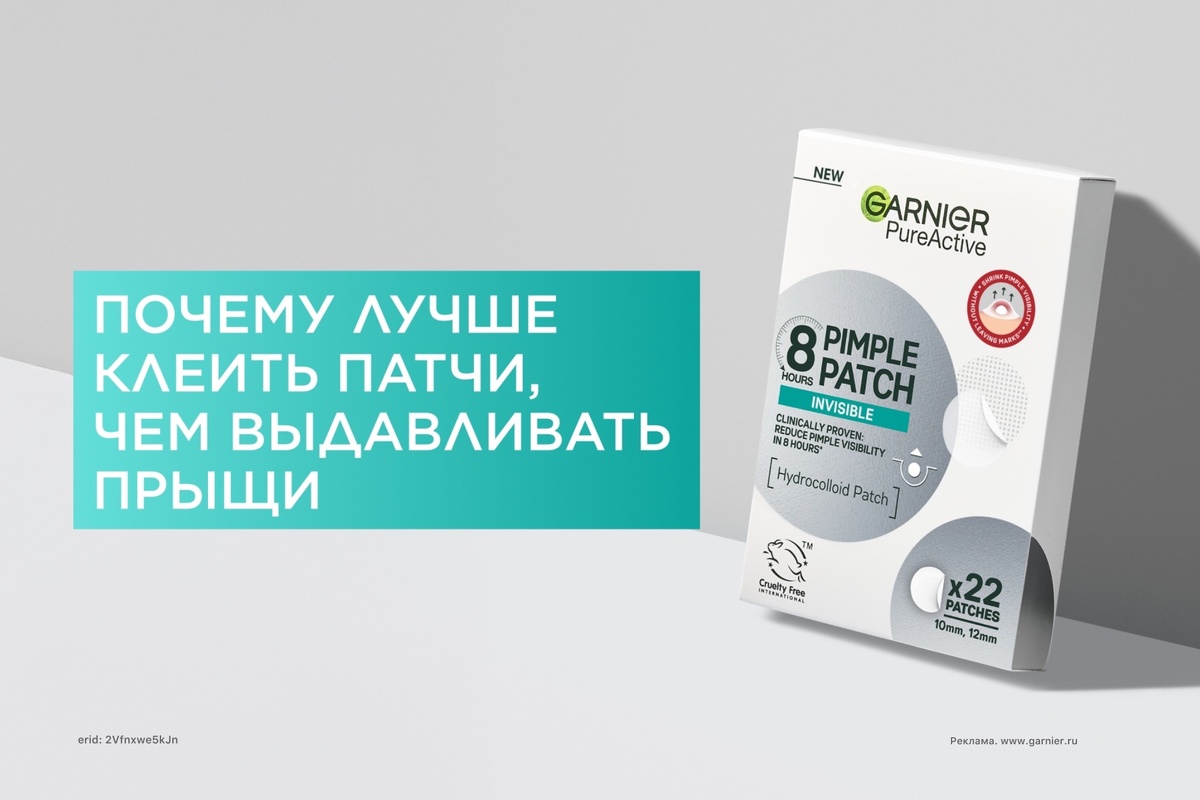 Руки так и тянутся выдавить созревший прыщ? Знакомая история. Такое решение кажется быстрым и эффективным: раз — и нет прыща. Но все мы понимаем, что в домашних условиях это не слишком-то безопасно для кожи. Проще и правильнее будет, например, наклеить патч. Как это работает и почему технология заслуживает вашего внимания, разберём на примере патчей Garnier. Патчи сделаны на основе гидроколлоидной технологии: они образуют на коже дышащую «плёнку», которая хорошо абсорбирует загрязнения. Уже за 8 часов* патчи Garnier сделают видимость прыщей меньше на 78%. Проще говоря, несовершенства уже не будут такими красными и раздражающими. Хорошо же? * клиническая картина видимости прыщей, 47 участников Наклеили, знаете, что процесс идёт, и выдавливать уже ничего и не хочется (или хочется не так сильно). Кстати, использовать патчи можно ночью, тогда с утра вас на лице будут ждать приятные новости. Из-за матовой, небликующей текстуры они подстраиваются под тон кожи и становятся практически незамет