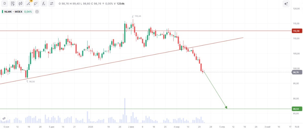 » Тикер: #NLMK Идея: Short ⬇️ Срок идеи: 3-4 недели Цель: 86,54 руб. Потенциал идеи: 12,39% Объем входа: 8% Стоп-приказ: 112,56 руб. 🧳 Технический анализ Пробитие поддержки восходящего тренда может свидетельствовать о смене тенденции. При объеме позиции в 8% и выставлении стоп-заявки на уровне 112,56 руб., риск на портфель составит 1,12%. Соотношение прибыль/риск составляет 0,89. 💿 Фундаментальный фактор #НЛМК — крупнейшая российская металлургическая компания полного цикла с вертикально интегрированной структурой и сильным балансом. Отчет за 9 месяцев 2025 года демонстрирует структурное ухудшение основного бизнеса: выручка упала на 15,8%, а операционная прибыль превратилась в убыток от продаж в размере 21,2 млрд руб. против прибыли 49,4 млрд руб. годом ранее, что указывает на критическое сжатие маржи на фоне снижения цен на металлопродукцию и недостаточного сокращения издержек. Чистая прибыль осталась положительной (32,9 млрд руб.) исключительно за счет доходов от участия в дочерни
