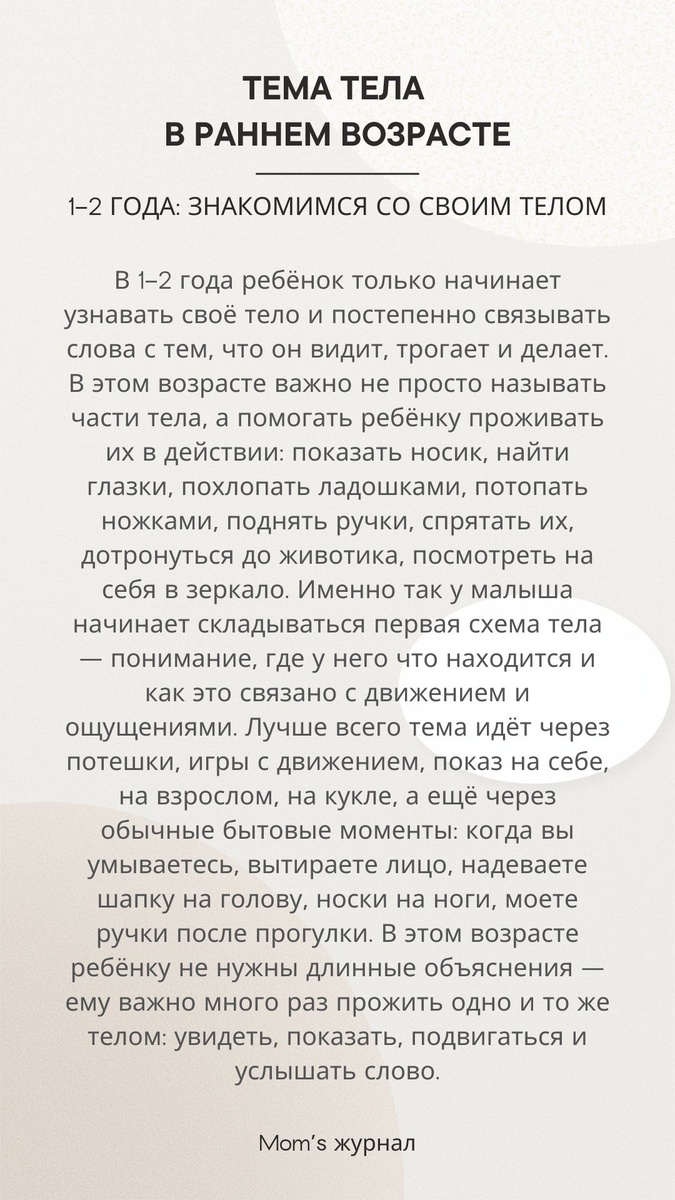 Тема тела в раннем возрасте — это не про школьную анатомию, а про важную базу: «я сам», «моё тело», «что я умею», «что я чувствую», «что со мной происходит», «как о себе заботиться». Поэтому изучать тело с малышом лучше как часть повседневной жизни. Самая грамотная логика здесь такая: моё тело → части тела → что они делают → что я чувствую → как я о себе забочусь → как бережно обращаться с собой и другими. Именно так ребёнок постепенно начинает не просто узнавать слова, а лучше понимать себя. Тема тела не должна ограничиваться только называнием частей тела. Хорошо, когда в ней сразу есть несколько линий: Познавательная — как называются части тела, для чего они нужны, чем люди похожи. Речевая — словарь по теме, глаголы действий, признаки и фразы про самочувствие. Эмоционально-социальная — по лицу можно понять настроение, телом мы выражаем чувства, другому тоже может быть больно, важно бережно относиться к себе и другим. И практическая — уход за собой, режим, движение, отдых, безопасно