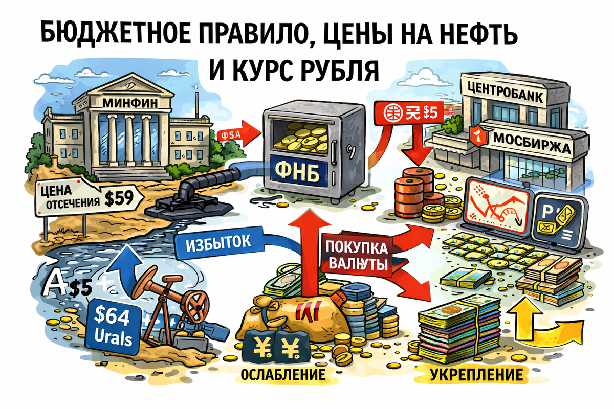 Минфин фиксирует определённый уровень цен на нефть — цену отсечения. Изначально это было $40 за баррель. Если доходы от нефти выше, например $45 за баррель, то $40 поступают в бюджет страны, а избыточные $5 откладываются в специальный Фонд национального благосостояния (ФНБ). И наоборот, если доходы ниже, например $35 за баррель, то недостающие $5 поступают в бюджет из ФНБ. Это позволяет снизить зависимость бюджета от цен на нефть.