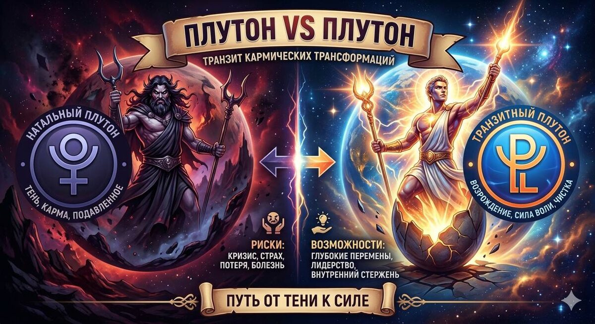 🧬В астрологии Плутон называют планетой смерти и возрождения. Но это не про физическую смерть, а про смерть старого — тех частей жизни, личности, обстоятельств, которые изжили себя. Плутон проходит медленно, его уроки длятся годами, но именно они превращают нас из «сырого материала» в зрелую личность. ПЛУТОН УПРАВЛЯЕТ: · глубинными бессознательными процессами, · кризисами и катализаторами, · властью, контролем, манипуляцией, · тем, что мы «хороним», но что затем воскресает в новом качестве. ❗️Он показывает, где и как человек должен пройти через неизбежное разрушение, чтобы обрести подлинную силу. ⚙️Растущий квадрат Плутона к Плутону (Возраст: 36–42 года) Это знаменитый «кризис среднего возраста». Время, когда жизнь проверяет вас на прочность. Задача — отсечь все не свое, чужое, навязанное и выйти на новый уровень личной власти. Ощущение: «Так, как раньше, больше невозможно, а как по-новому — еще не знаю». Что происходит: Рушатся браки, меняются профессии, уходят иллюзии о собственно