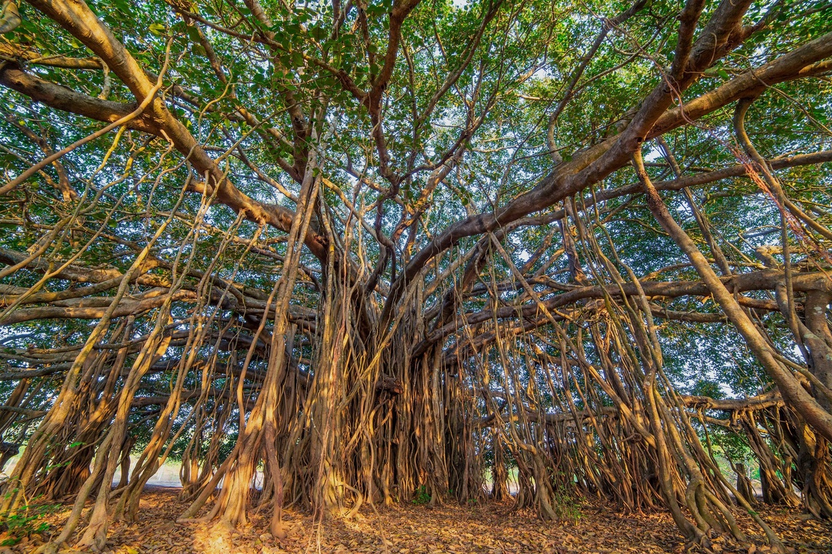 В одном из прошлых постов я рассказывала вам про «ходячую» пальму — Сократею, а теперь про дерево, которое притворяется целой рощей. Великий баньян — одно из самых странных деревьев на планете. Увидев его, легко подумать, что это лес: крона разрастается так широко, что занимает площадь как небольшой парк. Этому гиганту из Индийского ботанического сада около 200–250 лет, окружность кроны — почти 486 метров, а высота достигает 25 метров. Его секрет — в воздушных корнях. Они свисают с ветвей, как нити, и, дотянувшись до земли, превращаются в новые «стволы». Так одно дерево постепенно становится целой системой. Именно такой стиль роста фикусов называют — баньян. С этим баньяном связано много мифов. В Индии его считают священным: он символизирует бессмертие и вечную жизнь, потому что постоянно «перерождается» через новые корни. По легендам, под баньяном медитировали мудрецы, а бог Кришна укрывался в его тени. Есть и поверья, что в его густых переплетениях живут духи, поэтому к дереву относя