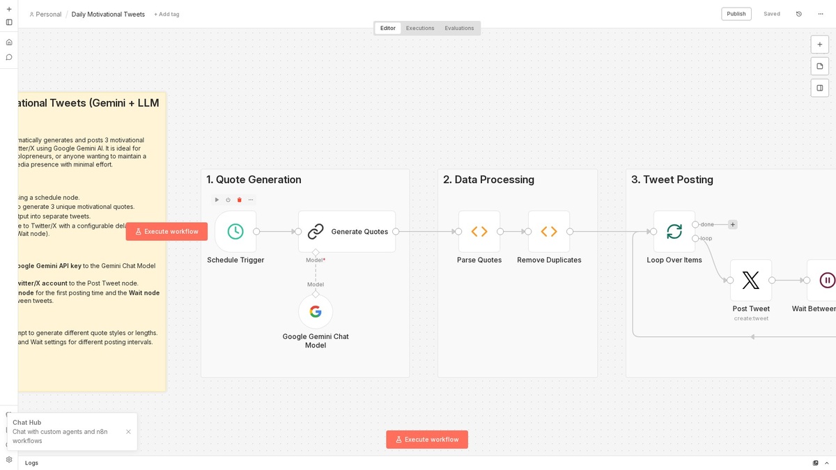 ⚡ Что делает: Автоматизация собирает мотивационные цитаты и генерирует твиты с помощью Chain LLM и Google Gemini. Каждое утро, по расписанию, она отправляет эти твиты в Twitter, разбивая их на партии для удобства. 👥 Кому подойдёт: Подходит для коучей, блогеров и всех, кто хочет вдохновлять свою аудиторию. 💡 Пример: Каждый день пользователи получают новый мотивационный твит, который они могут репостить или использовать в своих аккаунтах. 🔗 Ноды: Schedule Trigger, Chain Llm, Lm Chat Google Gemini, Split In Batches, Sticky Note 📊 Сложность: Средний #n8n #automation #nocode #chainllm #lmchatgooglegemini #scheduling ════════════════ 🎬 YouTube | ⚙️ Канал | 💬 Чат | 📮 Реклама