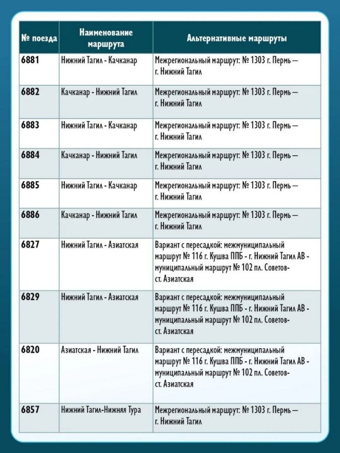 Свердловские власти опубликовали альтернативные маршруты для пассажиров, которые с 1 апреля лишатся привычных электричек. Жителям Нижнего Тагила и окрестностей вместо отменённых и сокращённых поездов предлагают автобусы — зачастую с пересадками. С начала следующего месяца в регионе прекращается движение 12 пригородных поездов, ещё у десятков рейсов сокращают маршруты и меняют график. В Свердловской пригородной компании изменения объясняют исполнением «транспортного заказа субъекта РФ» — фактически речь идёт о сокращении бюджетного финансирования убыточных перевозок. Власти же ссылаются на низкую загрузку: по данным Минтранса, на некоторых направлениях наполняемость вагонов не превышала 1%. Качканарское направление Наиболее серьёзные изменения затронули рейсы через Нижний Тагил. Все отменённые и переведённые на особый график электрички до Качканара (№6881, 6882, 6883, 6884, 6885, 6886) заменяет один автобусный маршрут — межрегиональный №1303, следующий из Перми в Нижний Тагил. Именно он