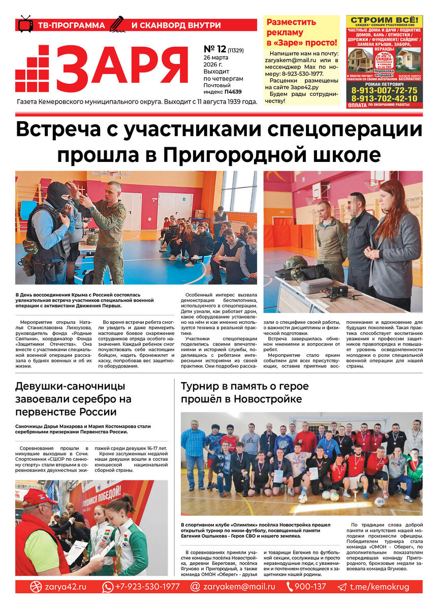 : Встреча с участниками спецоперации прошла в Пригородной школе Турнир в память о герое прошёл в Новостройке Как развивается культура в Кемеровском округе Когда откроют Озон Артистка и директор ДК Юлия Федорова - о себе и о творчестве Новый номер на нашем сайте