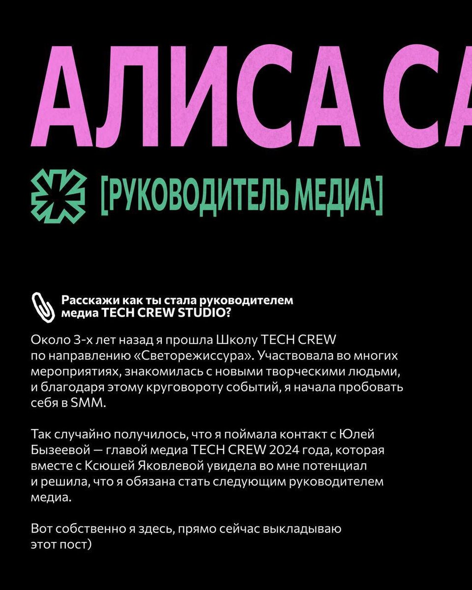 ! 🎨🎨🎨 Алиса 🎨🎨🎨 Савинова 🎨🎨🎨 [руководитель медиа] Алиса Савинова — руководитель медиа TECH CREW STUDIO. Координация работы со всеми типами контента в рамках медиа, PR-сопровождение, медиапланы, рубрики — это всё на ней. В карточках ниже Алиса поделилась историей своего пути и рассказала об основных изменениях в TCS за время своей работы. 🤩 #pro@techcrew_studio #face_to_face