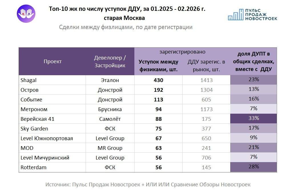 📍Очень полезную статистику по продажам по договорам уступки за 2025 год собрали мои коллеги из Пульса продаж Новостроек и канала ИЛИ ИЛИ. В чем ее ценность? Если вы планируете покупать квартиру для перепродажи по уступке, полезно понимать, какое количество квартир продается по уступкам относительно количества конкурентов. Много конкурентов, мало продаж в уступках — значит, продавать по уступке долго и с большим дисконтом от цен застройщика. ▪️На первом месте по уступкам в Москве за 2025 год — ЖК «Шагал». В «Шагале» большой процент квартир приобретается в рассрочку, и значительное количество — с целью перепродажи. ▪️Продаж по переуступкам в проекте за 2025 год было — 430 шт., что очень много. Не учитывались сделки на вторичном рынке в проекте, а они уже есть. Это прямой показатель того, что спрос высокий и цены в уступках и вторичке из-за огромной конкуренции в проекте интересные и действительно евро-3 можно найти в готовом доме дешевле 500 тыс/м². А евро-2 в готовом доме — за 53