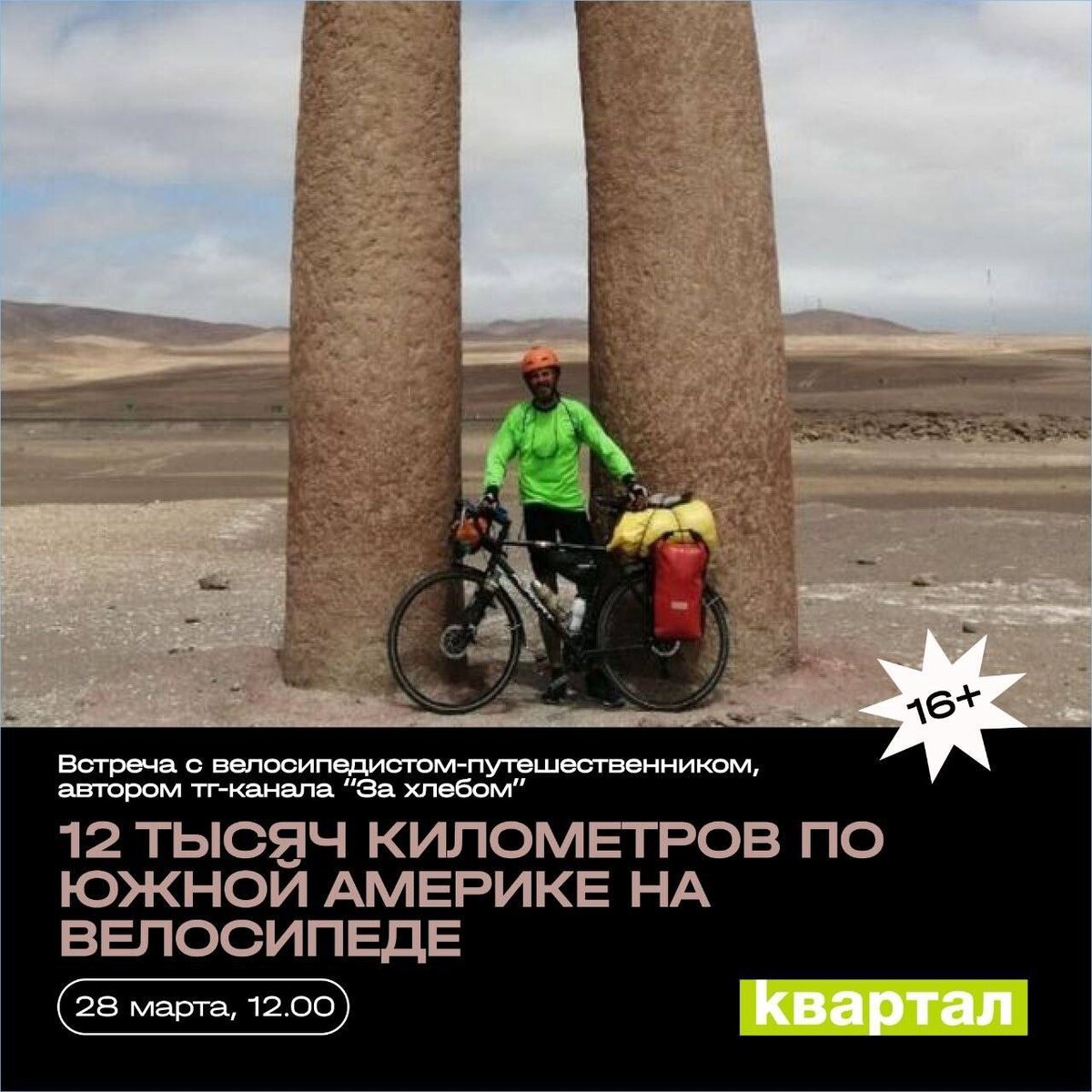 🚵♀️ 🗓️ 28 марта, 12.00 📍Квартал, Ленина 78 Велосипедист-путешественник, автор телеграм-канала "За хлебом", Александр Коптилкин, приглашает на познавательную встречу, на которой расскажет о своих приключениях по Южной Америке на своём двухколёсном коне. 🏷️ вход – свободные взносы #28марта26@culturnik 🕊️пойду • ❤️ нравится • ✅рекомендую