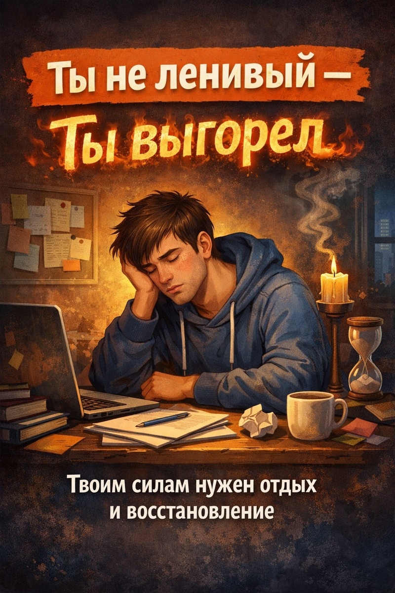 — не может начать даже простую задачу И думает: «Я стал слабым». Нет. Ты не стал слабым, ты просто перегорел. Лень — это когда: ты не хочешь. Выгорание — это когда: ты не можешь. Разница как между: «не хочу идти в зал» и «у меня нет сил встать с кровати». Твоя психика не враг. Когда нагрузки слишком много,
