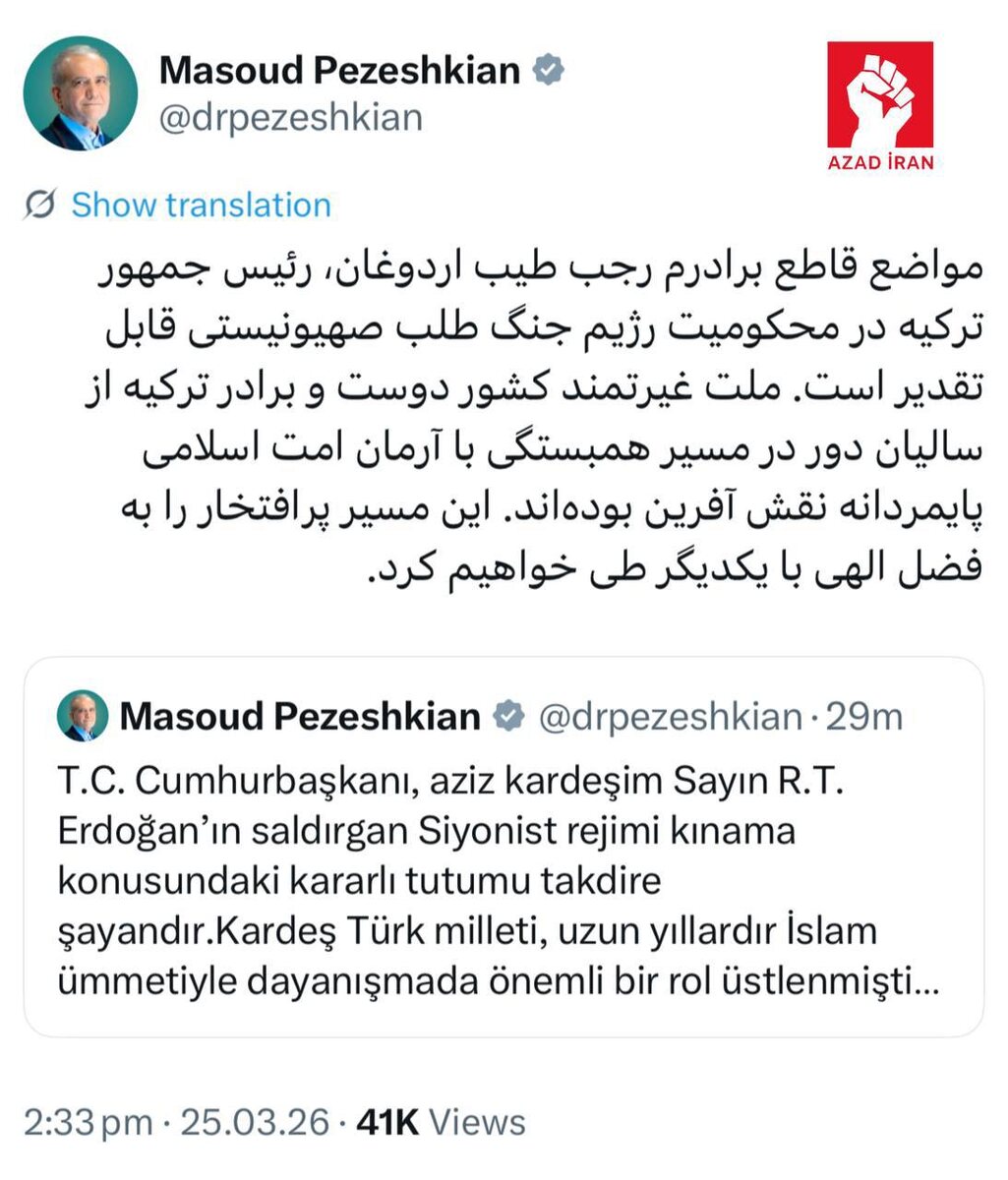 ⚡️ Иранский президент отметил позицию турецкого лидера по региональным событиям и отдельно поддержал его резкую критику произраильского курса. Подпись канала убрана. Подпишитесь на канал