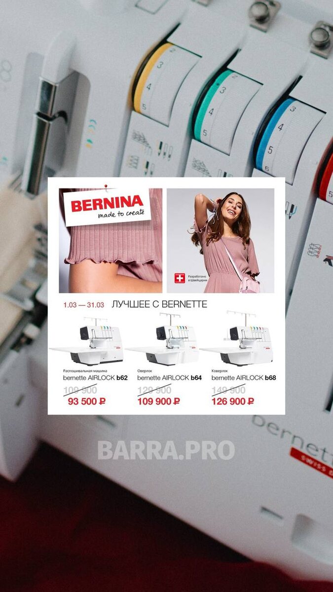 Bernette Airlock от компании BERNINA. Ключевые преимущества серии: ✅Пневмозаправка: Избавляет от самой сложной части подготовки машины - кропотливой ручной заправки петлителей. ✅Рабочее пространство: У всех моделей увеличено расстояние справа от иглы (130 мм), что удобно для крупных проектов. ✅Система MTC: Микрорегулировка натяжения (Micro Thread Control). Что он нам дает? Когда у нас образуются воздушные петли или валик при обработке края, мы можем отрегулировать не только натяжением нити, но и этим регулятором. Строчка станет идеальной 👌🏼 ✅Есть все необходимые регулировки: прижим давления лапки, дифференциальная подача, длина стежка, ширина обрезки. ✅Яркая подсветка: Зона шитья освещается 5 светодиодами. Bernette b64 AIRLOCK — четырехниточный оверлок. 16 видов швов, встроенная рукавная платформа для манжет, коленоподъемник (FHS) и большой приставной столик в комплекте. Скорость шитья — до 1300 стежков в минуту. 🏷️109 900₽ вместо 129 900₽, выгода 20 000₽. Bernette b62 AIRLOCK —