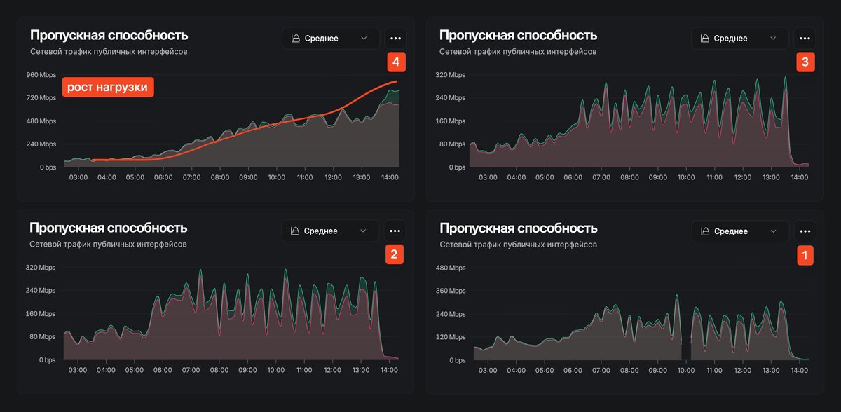 После 10 минут стабильной работы сервер начинали замедлять на следующие 10-15 минут, снижая суммарную скорость с 600 Мбит/с до 200 Мбит/с, что приводило к проблемам работы с серверами телеграм. Волны замедления можно заметить на графиках 1-3 В данный момент проблемные сервера временно исключены из пула и добавлен отдельный, более стабильный сервер. 📱 Бесплатный прокси tg.network-a1.cc 🍀Резервный прокси mt.network-a1.cc 📱 VPN сервис Network A1