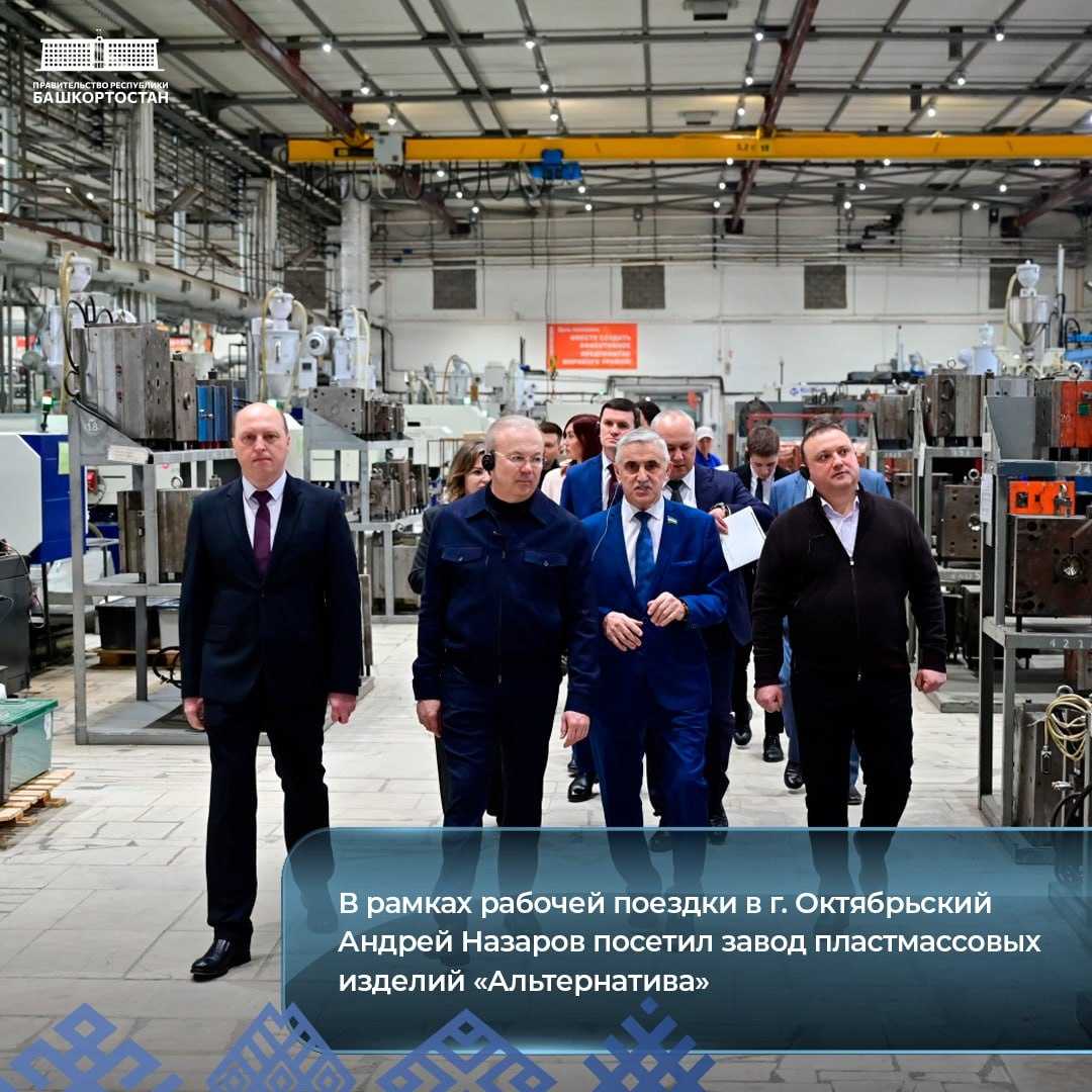 Октябрьский 📍 Сегодня, 25 марта 2026 года, в г. Октябрьский проходит выездное заседание под руководством Премьер-министра Республики Башкортостан Андрея Назарова и членами Правительства региона. В рамках рабочей поездки также была запланирована встреча с представителями бизнес-сообщества города, посещение предприятий и организаций. ➡️ Андрей Назаров посетил завод пластмассовых изделий «Альтернатива», основной деятельностью которой является производство изделий из пластмасс. Здесь производится более 2000 наименований изделий. Объем отгруженной продукции за 2025 год составил 5,9 млрд. рублей. — Мы видим, что руководство ООО «Альтернатива» создает рабочие места и укрепляет промышленный потенциал нашей республики. Сейчас предприятию необходима поддержка по субсидированию новых проектов. Поручил профильным министерствам детально разобраться и найти решения, — подвел итоги объезда глава кабмина. Подписаться на Правительство РБ в Макс