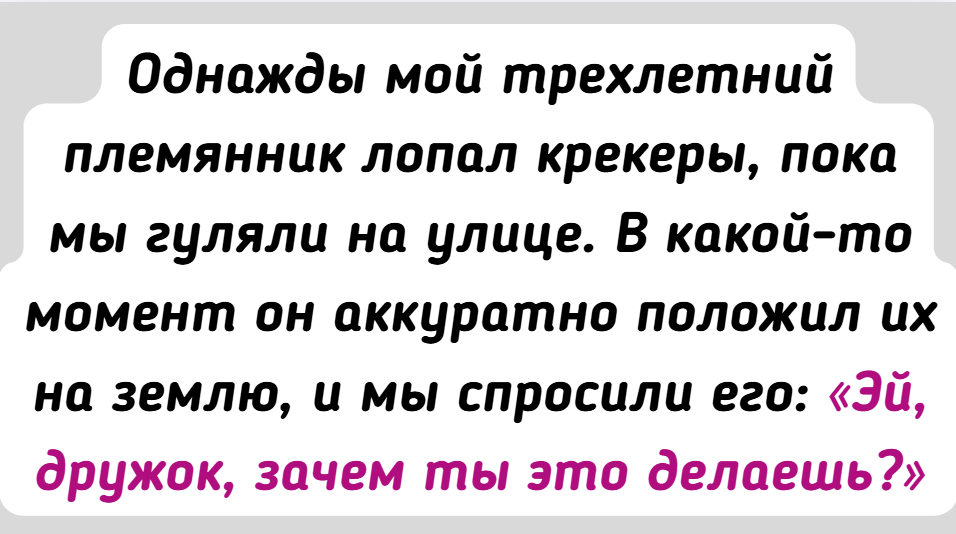 - Однажды мой трехлетний племянник лопал крекеры, пока мы гуляли на улице. В какой-то момент он аккуратно положил их на землю, и мы спросили его: «Эй, дружок, зачем ты это делаешь?» Его ответ: «Я кладу их на землю, чтобы не уронить».