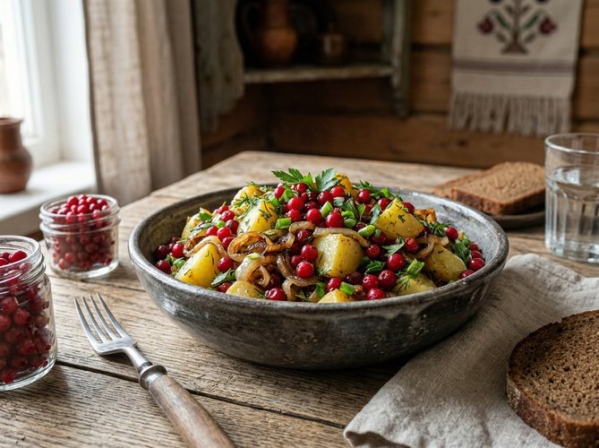 В чем фишка: это идеальный баланс простой еды. Сладость печеного лука, терпкость брусников и рассыпчатая картошка создают магию из ничего.