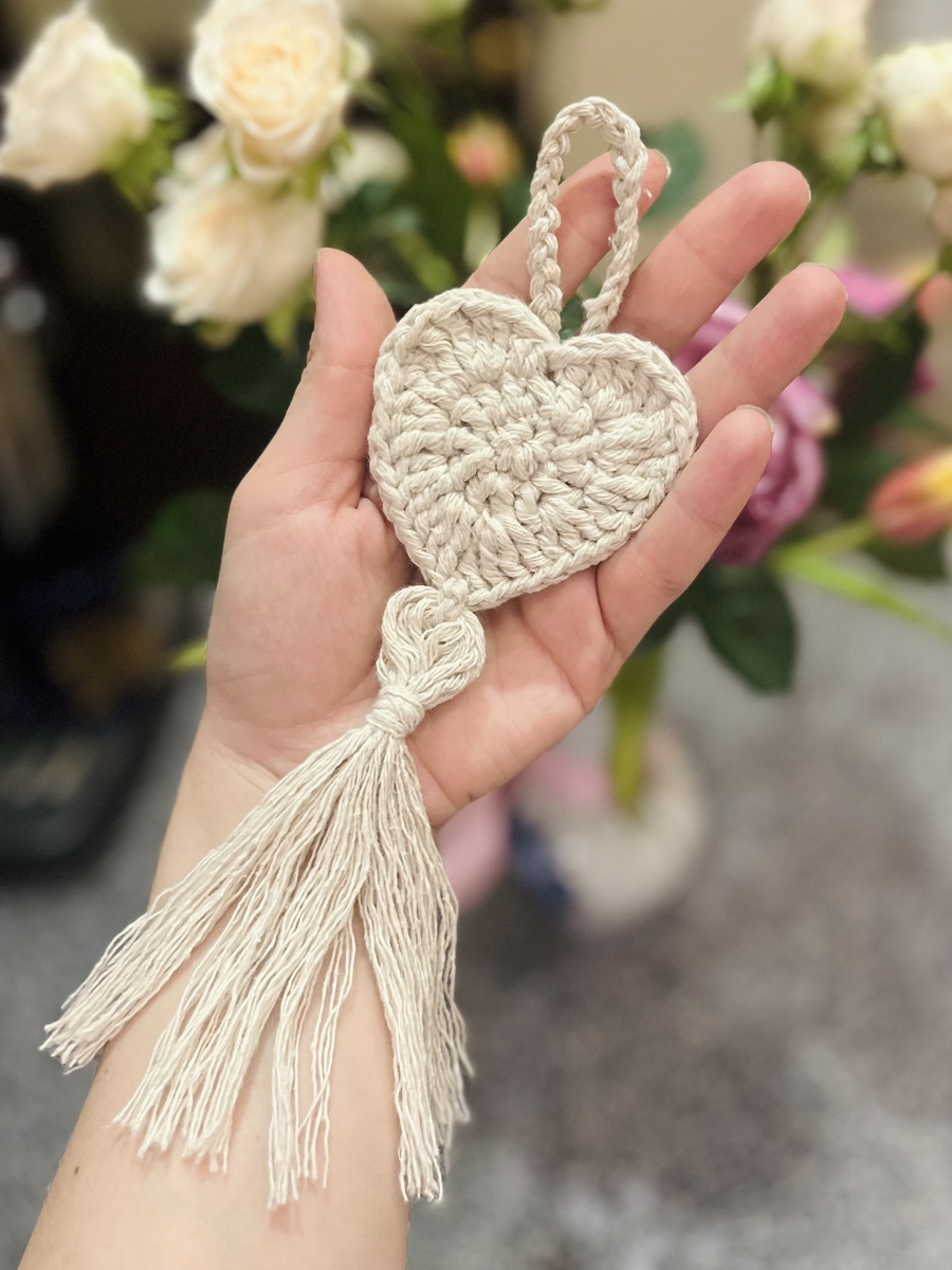 Вяжется данная подвеска очень легко. Расход пряжи минимальный. Я использовала хлопковый шнур (канат) 2,5 мм, крючок №3.