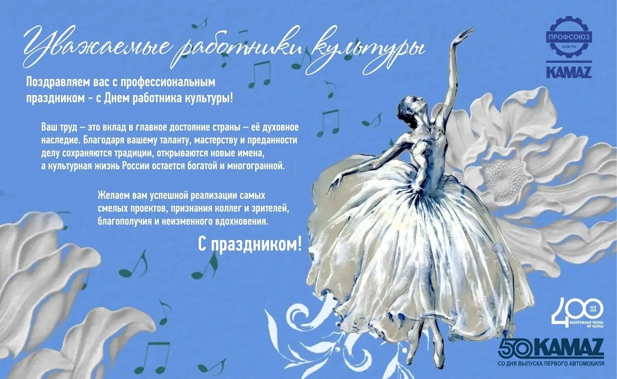 Ваш труд — это вклад в главное достояние страны — её духовное наследие. Благодаря вашему таланту, мастерству и преданности делу сохраняются традиции, открываются новые имена, а культурная жизнь России остается богатой и многогранной. Желаем вам успешной реализации самых смелых проектов, признания коллег и зрителей, благополучия и неизменного вдохновения. С праздником!