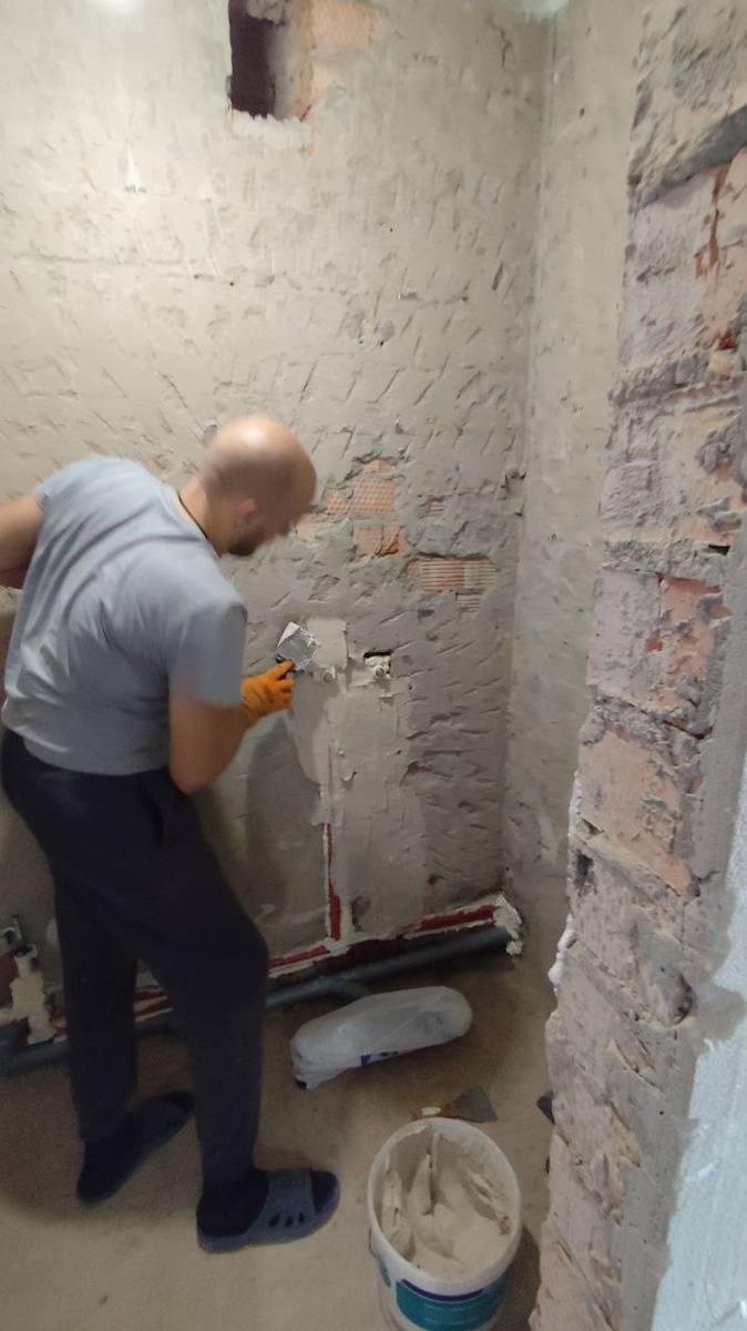 Процесс идёт 😁. Подрезали пену, теперь Володя шпаклюет стены, замазывает трубы. Сегодня хотим зашпаклевать, чтобы потом уже выкладывать поддон
