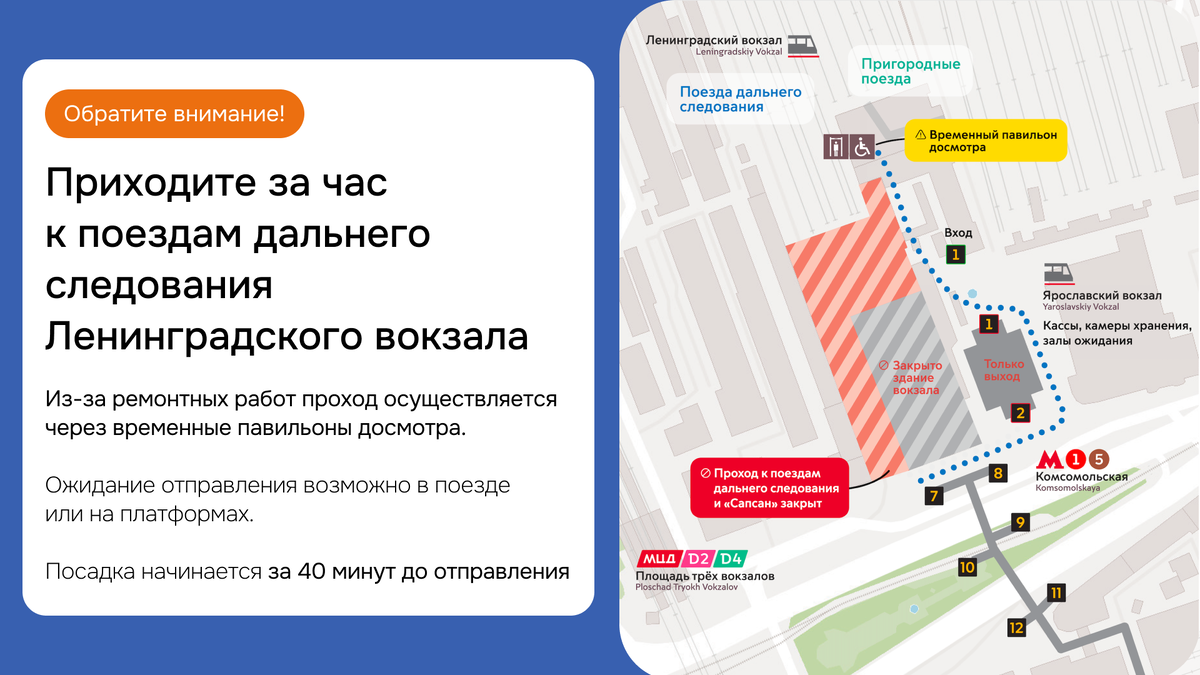Вниманию пассажиров‼️ На Ленинградском вокзале временно изменятся маршруты прохода на платформы поездов дальнего следования. Рекомендуем приезжать на вокзал заранее, чтобы спокойно пройти все необходимые зоны и не опоздать на посадку. 🚂Посадка на поезд начинается за 40 минут до отправления. Также обращаем внимание, что услуга бизнес-зала на Ленинградском вокзале недоступна. Телефон службы заботы о пассажирах: 8 (800) 777-70-20
