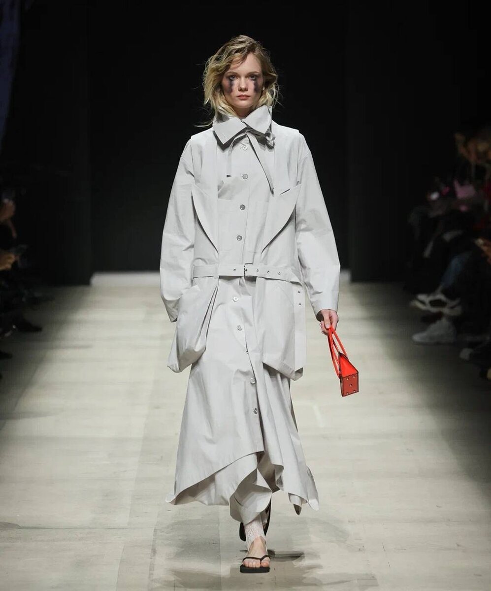 В центре коллекции — наследие Лены Макашовой, основателя и главного дизайнера бренда. Линейка переосмысляет ее фирменный стиль через характерные элементы: асимметричные многоярусные складки, платья в сочетании с жилетами, объемные акцентные брюки и обилие карманов. Канал Московской недели моды теперь можно найти в МАХ. Подписывайтесь!