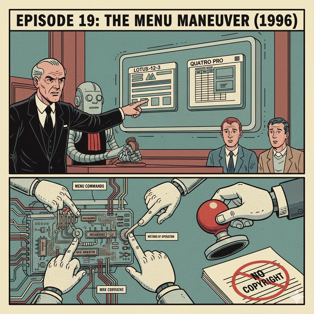 💻 САГА О ПИКСЕЛЯХ И ПАТЕНТАХ Часть 19. Lotus Development Corp. v. Borland International, Inc. (1996): Верховный суд ограничивает авторское право на программное обеспечение Это дело, дошедшее до Верховного суда США, установило одно из самых значительных ограничений на защиту программного обеспечения авторским правом, проведя четкую грань между защищаемым выражением и незащищаемым «методом работы». 🍜 Прелюдия В 1980-х годах программа для работы с электронными таблицами Lotus 1-2-3 была доминирующим продуктом на рынке. Одной из ее ключевых особенностей была сложная иерархическая структура меню (например, /File -> Save -> Enter). Пользователи привыкли к этой системе и даже писали «макросы» — последовательности команд для автоматизации задач, которые были привязаны к этой структуре меню. 😡 Конфликт Borland выпустила свою конкурирующую программу Quattro Pro. Чтобы облегчить пользователям Lotus 1-2-3 переход на свой продукт, Borland включила в Quattro Pro альтернативный интерфейс,