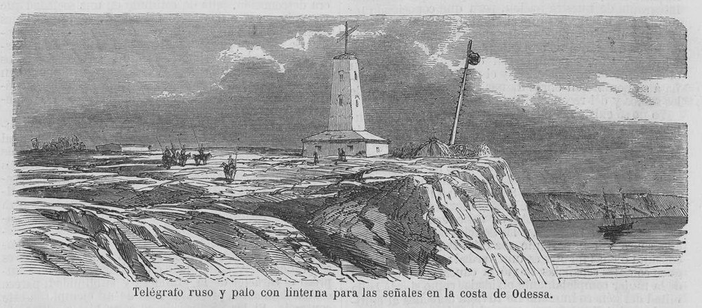 Русский телеграф на побережье Одессы. 1856г. И сигнальная мачта с копной сена в корзине наверху. У основания шеста лежит запас сена. При объявлении тревоги пограничник лез наверх по шесту (на нем видны ступеньки) и поджигал сено, привлекая внимание. (Гравюра Одессы с испанского ресурса со старыми газетами.) ⚓️ Типичная Одесса || ❗️Прислать новость / Фото❗️ | | Канал по повесткам👈 | |Мы в MAX👈
