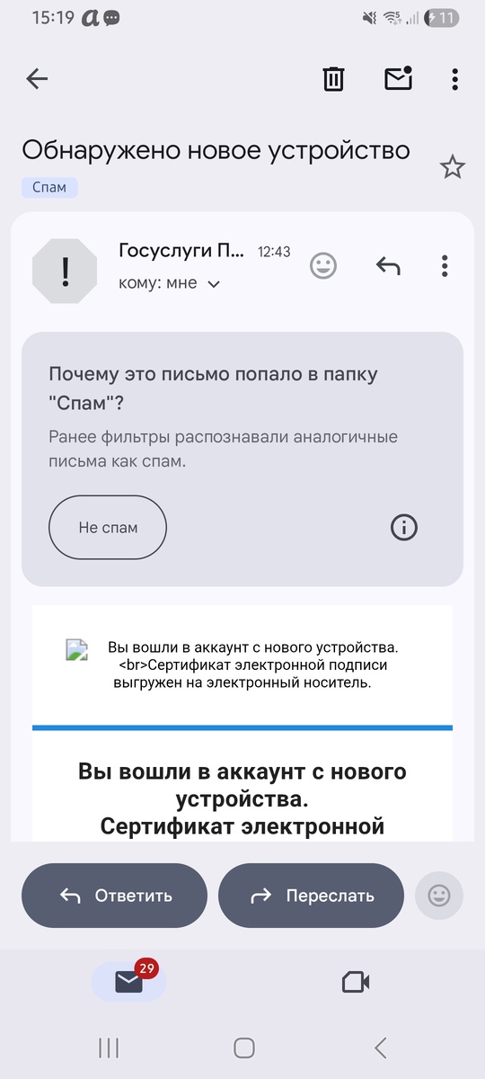 - Фейковое письмо — вы получаете email с темой «Обнаружено новое устройство» или «Сертификат электронной подписи выгружен на электронный носитель»