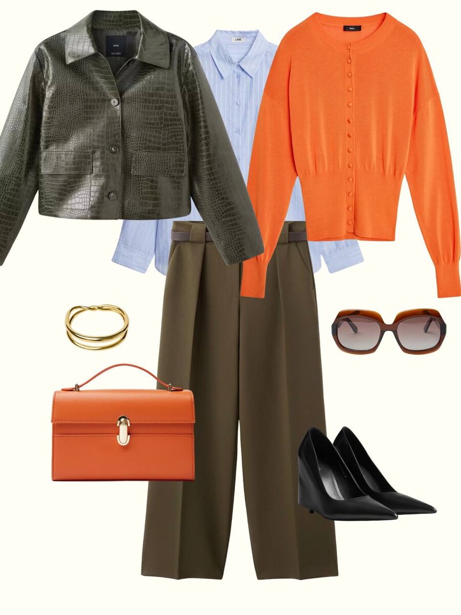 Очень люблю темно-зеленый с оранжевым и рядом с чем-то освежающим, как голубая рубашка, например