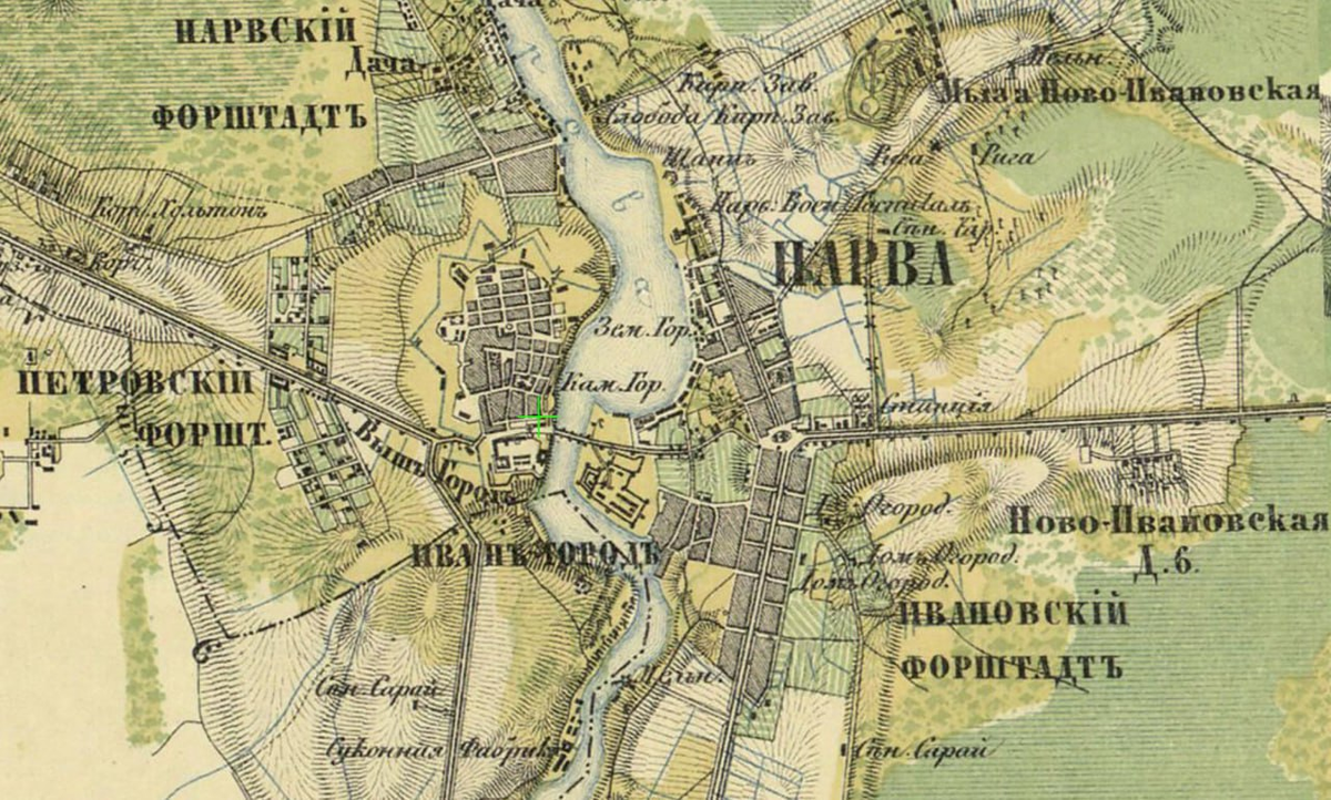 Нас в школе учили, что 23 февраля 1918 года родилась Красная армия, остановившая в тот день кайзеровские войска под Псковом и Нарвой. Потом выяснилось, что не все так однозначно, но сегодня воспользуемся оказией, чтобы продолжить цикл о разделенных городах. Поначалу не хотел включать в их число Нарву, но, взглянув на эту карту 1868 года , понял, что не включить нельзя: Неожиданно видеть надпись «Нарва» справа, а «Ивангород» – слева, но никакой ошибки нет: город Нарва Санкт-Петербургской губернии лежал на двух берегах реки Наровы, а правобережная часть по площади, как видим, даже превосходила левобережную. Нарва, заложенная в 1223 году датчанами на левом берегу реки, вместе со всей Эстляндией была продана в 1346 году Ливонскому ордену и на многие века стала восточным оплотом «немецкого мира». С определенными оговорками это так и сегодня, а российско-эстонская граница по Нарове, будучи наследницей датско-новгородской, является одной из старейших в Европе (но обо всем это было в прибалт
