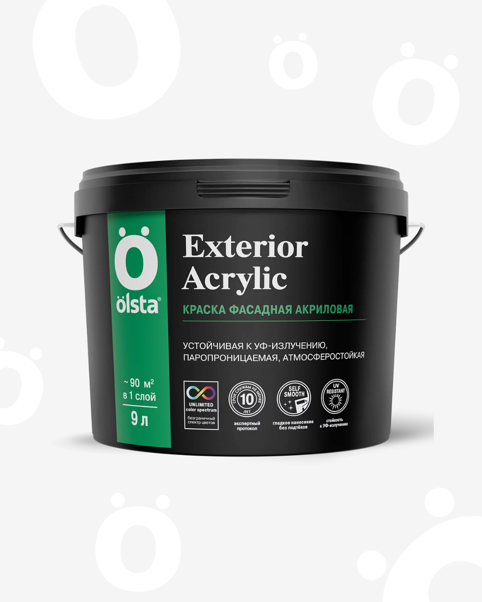 Часто бывает так: выбрали красивый цвет, потратили силы на покраску, а через пару сезонов фасад выглядит блекло, пошли пятна, а местами покрытие и вовсе отошло от стены. Знакомая ситуация? Все дело в том, что не все краски рассчитаны на агрессивную внешнюю среду: перепады температур, осадки и ультрафиолет. Для тех, кто хочет сделать ремонт один раз и надолго, мы создали Olsta Exterior Acrylic. Это акриловая краска, которая специально разработана для сложных минеральных поверхностей: бетона, кирпича, цементной и гипсовой штукатурки, гипсокартона. Она не просто закрывает стену, а создает прочное, атмосферостойкое покрытие. Преимущества: