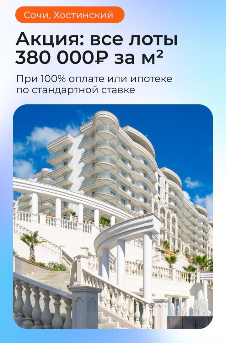 Акция 1 корпус • Любой лот за 380 000 за м² при 100% оплате. • Тестовый запуск отеля: 3 квартал 2026 года. За подробностями в личку 📩 #недвижимость #риэлтор #сочи #недвижимостьсочи В этом посте есть большое видео, которое не загрузилось в Дзен. Откройте оригинал поста в телеграме, чтобы его посмотреть